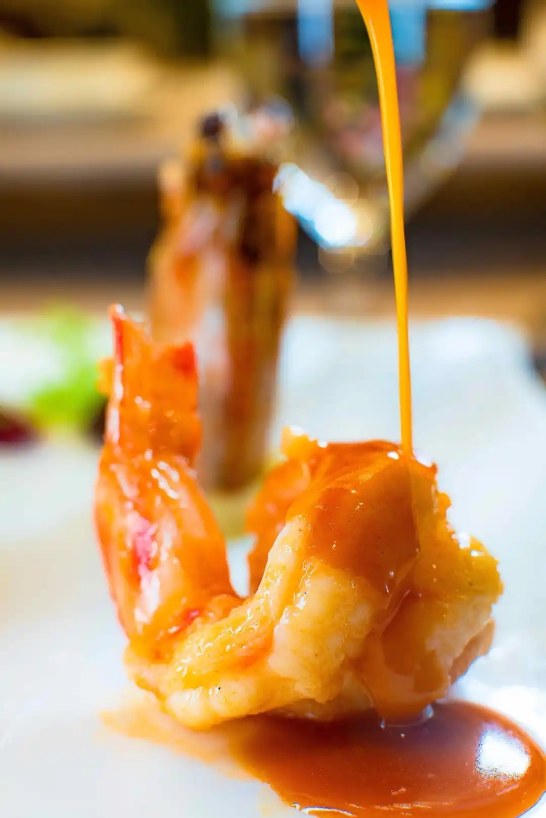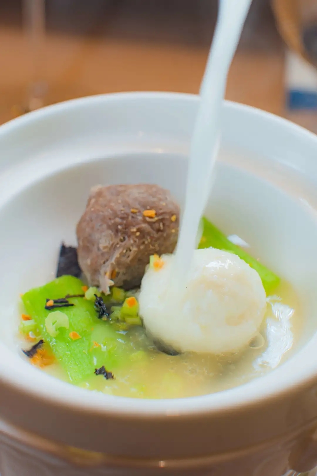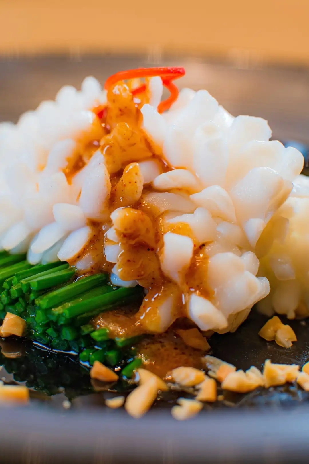 沙茶酱灼鲜鱿鱼:新鲜得荧光闪闪的鲜鱿鱼,一个有两三斤重,精细的麦穗刀法,将鱿鱼的肌肉纤维彻底破坏,在上汤里一灼,几十秒的功夫,温度达到60度,肌肉收缩卷成漂亮的麦穗状,铺在同样灼熟的韭菜花上面,淋上煮过的沙茶酱。这个菜,新鲜的鱿鱼在60度时,汁液没有因为肌肉过度收缩而被挤出,所以鲜味达到峰值,而神奇的沙茶酱,则为这道菜增香提鲜。据潮州菜研究专家张新民老师的研究成果,沙茶酱是19世纪后期东南亚烤肉香料的潮汕改良版,源于印尼语Satay,原料构成极其复杂,有花生、芝麻、黄豆、花椒、辣椒、大小茴香、桂皮、鲽鱼干、葱油、蒜片、白糖、盐、油、南姜、虾米、香菜籽、芥菜籽、咖喱油、椰汁、虾酱、香茅等等,简直就是潮汕版的咖喱,这种复合香料,潮州菜的做法一般是混着主料炒,御口福将它煮过后做为酱汁淋在鱿鱼上,想要浓郁还是清淡,自己做主。韭菜花白灼,吃到的是韭菜花的本味,如果喜欢重口味,沙茶酱就在旁边侍候。这种粤式轻烹饪做法,简约!