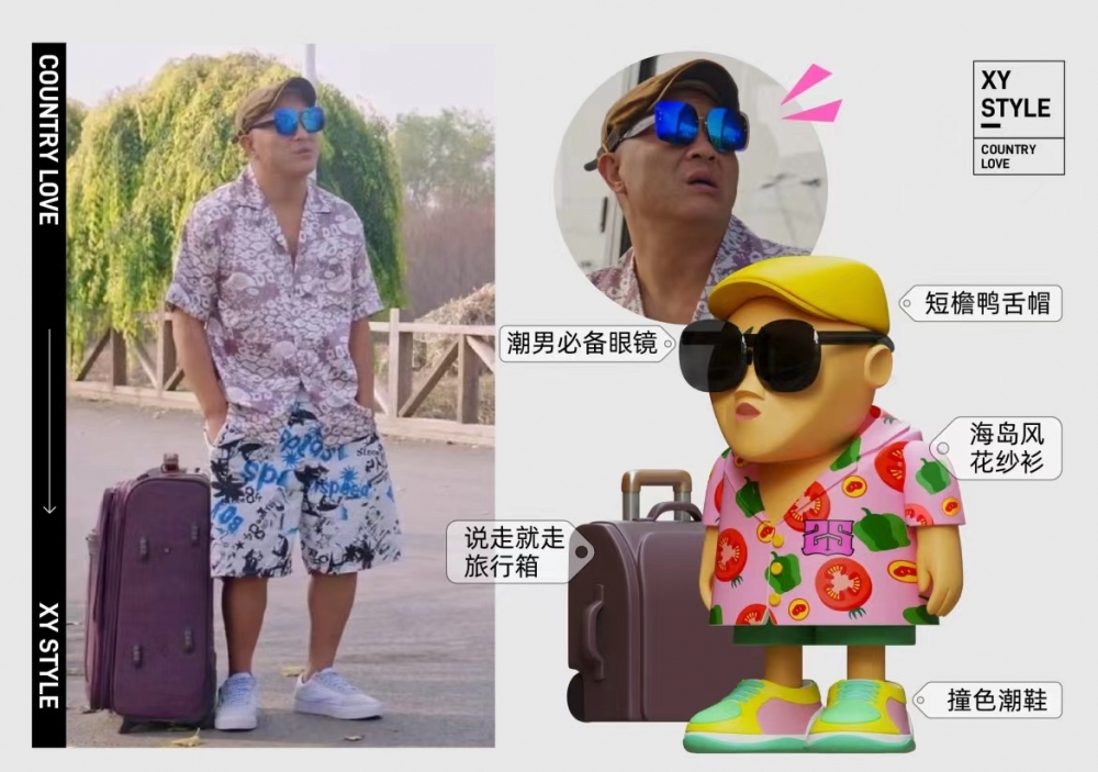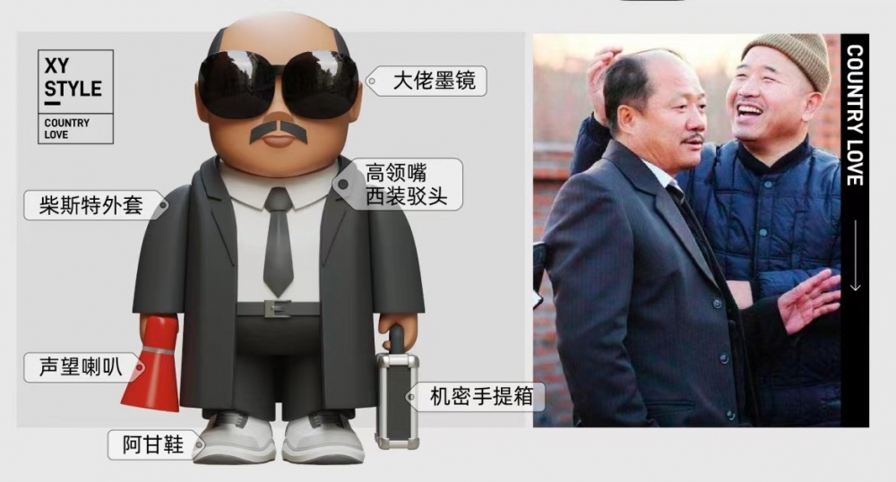 以此为基点,2.0版又根据人物情节为角色设计添加符合其人设的潮流服饰元素——刘能穿上了衬衫马甲、戴上了领带,低调绅士;赵四则是撞色混搭的海岛纱衫和军大衣;谢广坤身穿柴斯特外套,手拿“声望喇叭”,妥妥的象牙山“教父”;宋晓峰和王木生的“大金链子+貂”,乡村土豪组合;还有视觉风王天来、象牙山魔童谢飞机的混搭风。盲盒的设计于服饰细节之中对应剧中人物情节。