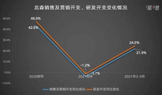 2020财年,北森花在销售及营销开支、研发上的费用分别为3.0亿元、2.2亿元;到2021财年,这两部分费用为2.8亿元、2.1亿元,都有一定幅度的下降,分别同比减少3.7%、1.2%;截至2021年9月30日的六个月内,又再次同比扩大,分别增长21.9%、24.5%。