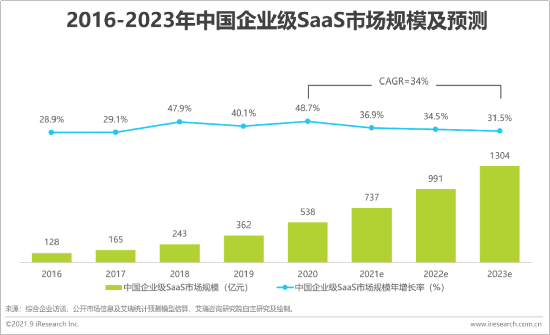 据艾瑞咨询数据,经过2018年的市场回暖和2019年增速小幅回落,受疫情推动,2020年SaaS市场增速再度上扬。2020年SaaS市场规模达538亿元,同比增长48.7%。现阶段资本市场对SaaS的态度更加理性,各细分赛道发展也逐渐成熟,预计未来三年市场将维持34%的复合增长率持续扩张。