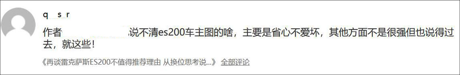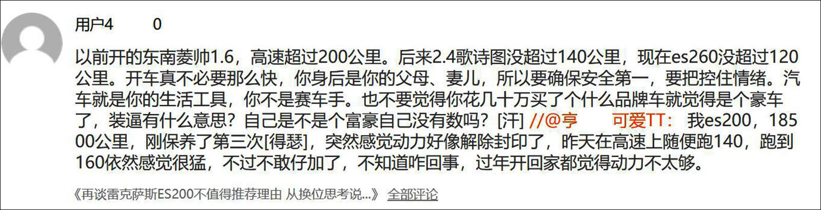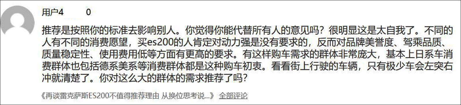另外这一条评论中称:买ES200肯定对动力没要求,对品牌美誉度、驾乘品质、质量稳定性、使用费用低等方面有更高的要求……