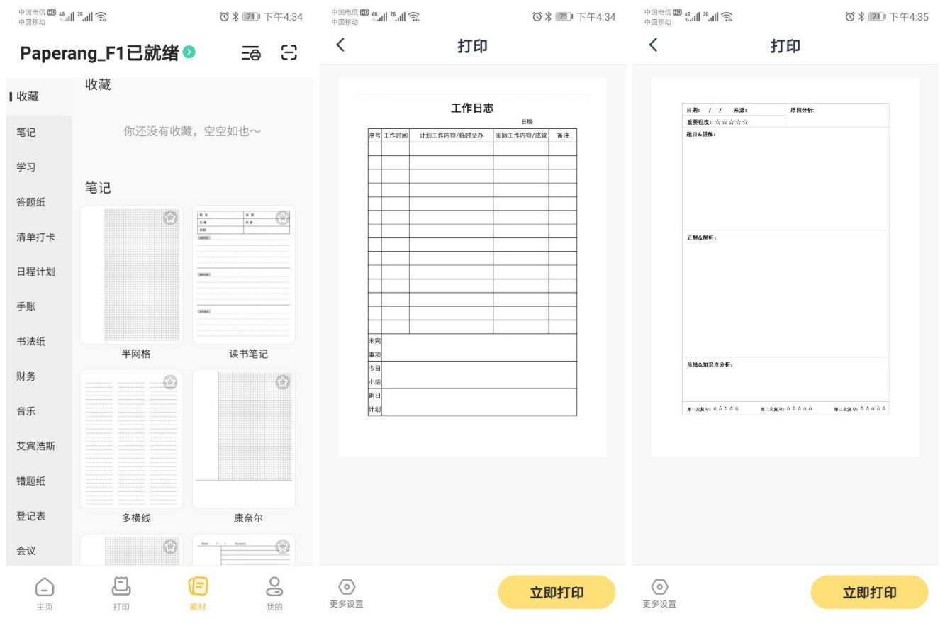 笔者非常感兴趣的是在在素材板块里的打印模板涵盖了打印笔记本、答题纸、日程计划、书法纸、课程表、错题纸等等,可以随时打印来满足孩子不同的需求。
