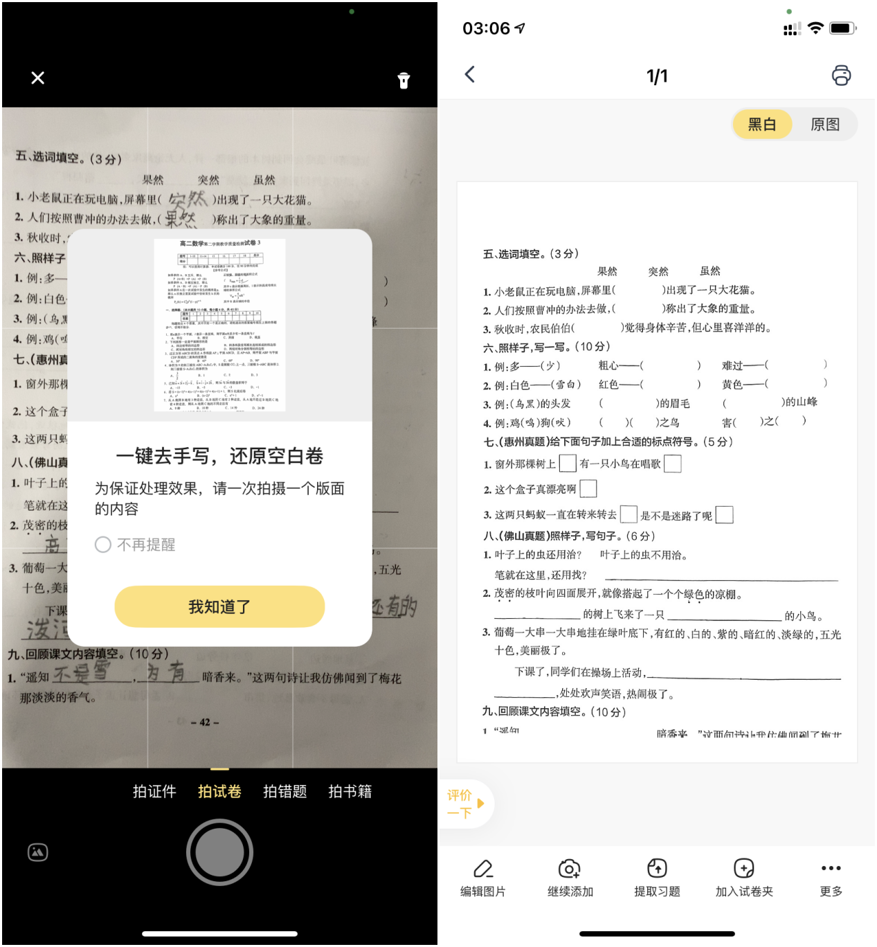 另外有个比较有意思的功能那就是还可以清除做过的试卷上的笔迹,快速还原整洁试卷,然后进行打印。这个功能可以温故知新了。