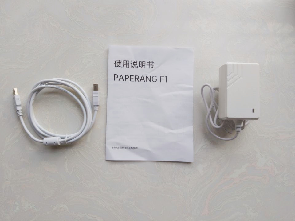 喵喵机家用学习打印机F1的配件简单而又实用,主要有一条电源线以及一条连接电脑的USB线,和一本说明书。