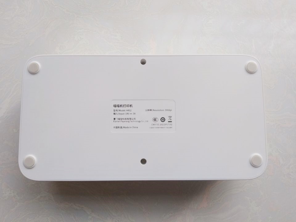 为了保持稳定,喵喵机家用学习打印机F1的底部还配备了四个垫脚,另外还可以清楚了解到关于这款产品的具体信息。