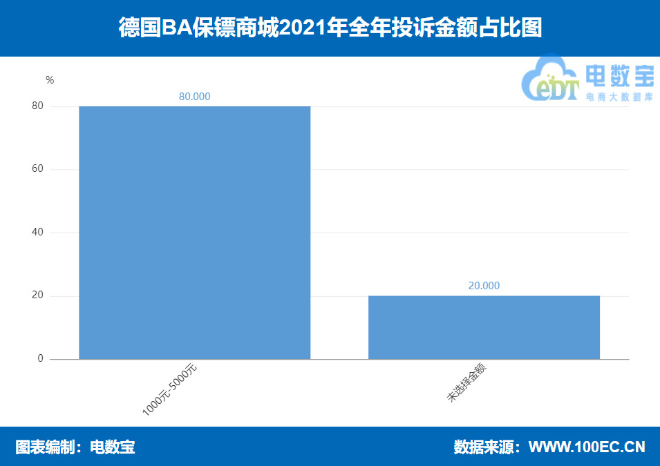 根据网经社旗下电商大数据库“电数宝”显示,用户投诉“德国BA保镖商城”的消费金额主要在1000-5000元及未选择金额,占比分别为80%、20%。