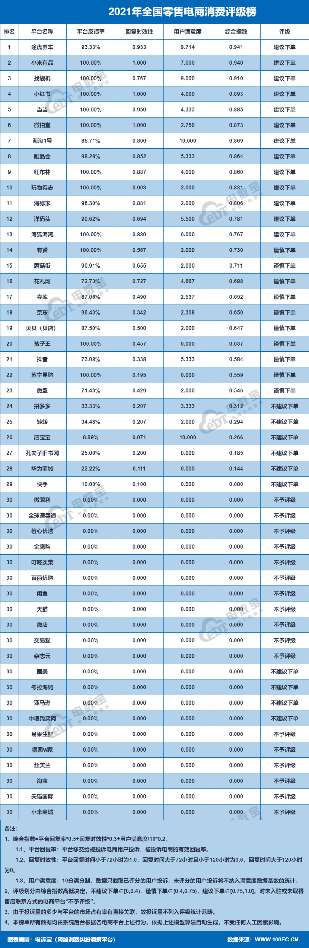 2021年全国零售电商消费评级榜依据运行十余年的第三方国内知名网络消费纠纷调解平台“电诉宝”(315.100EC.CN)在2021年受理的全国480家电商企业用户消费纠纷案例海量大数据得出,依据反馈率、反馈时效、满意度多项指标模型评估,其数据评级完全由系统自动生成,独立、客观、公正。