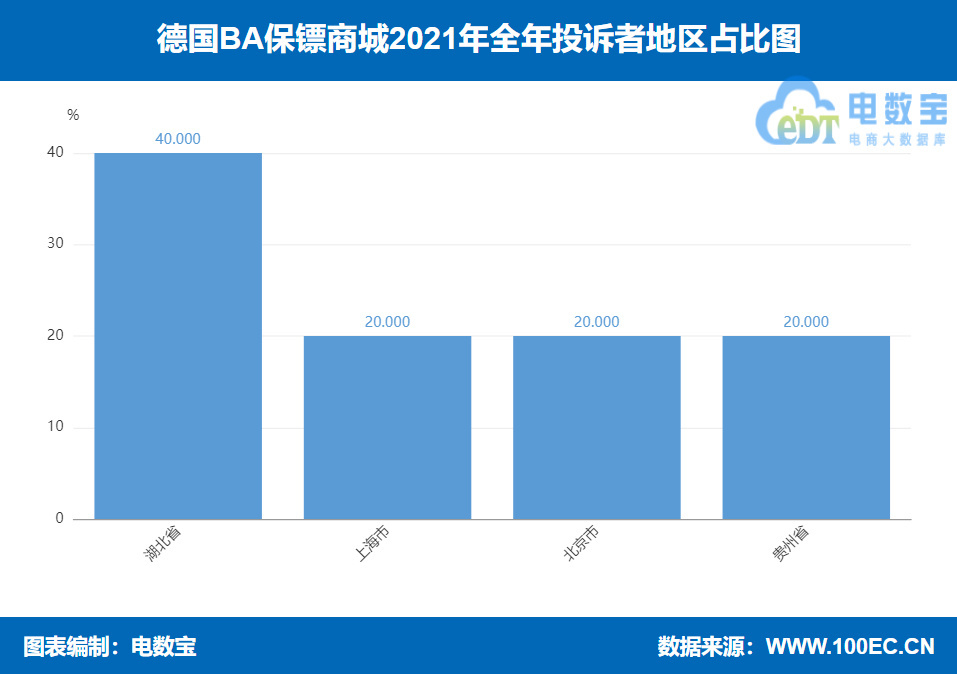 根据网经社旗下电商大数据库“电数宝”显示,2021年投诉“德国BA保镖商城”的用户主要集中地区为湖北省、上海市、北京市、贵州省。