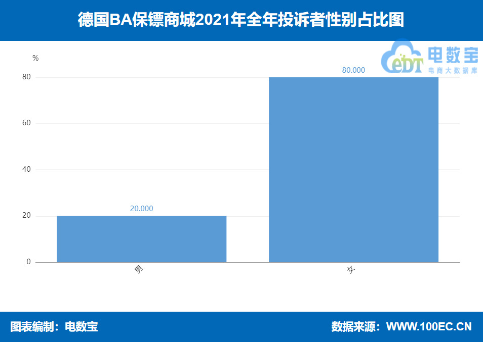 根据网经社旗下电商大数据库“电数宝”显示,在投诉“德国BA保镖商城”的用户中男性占20%、女性占80%。
