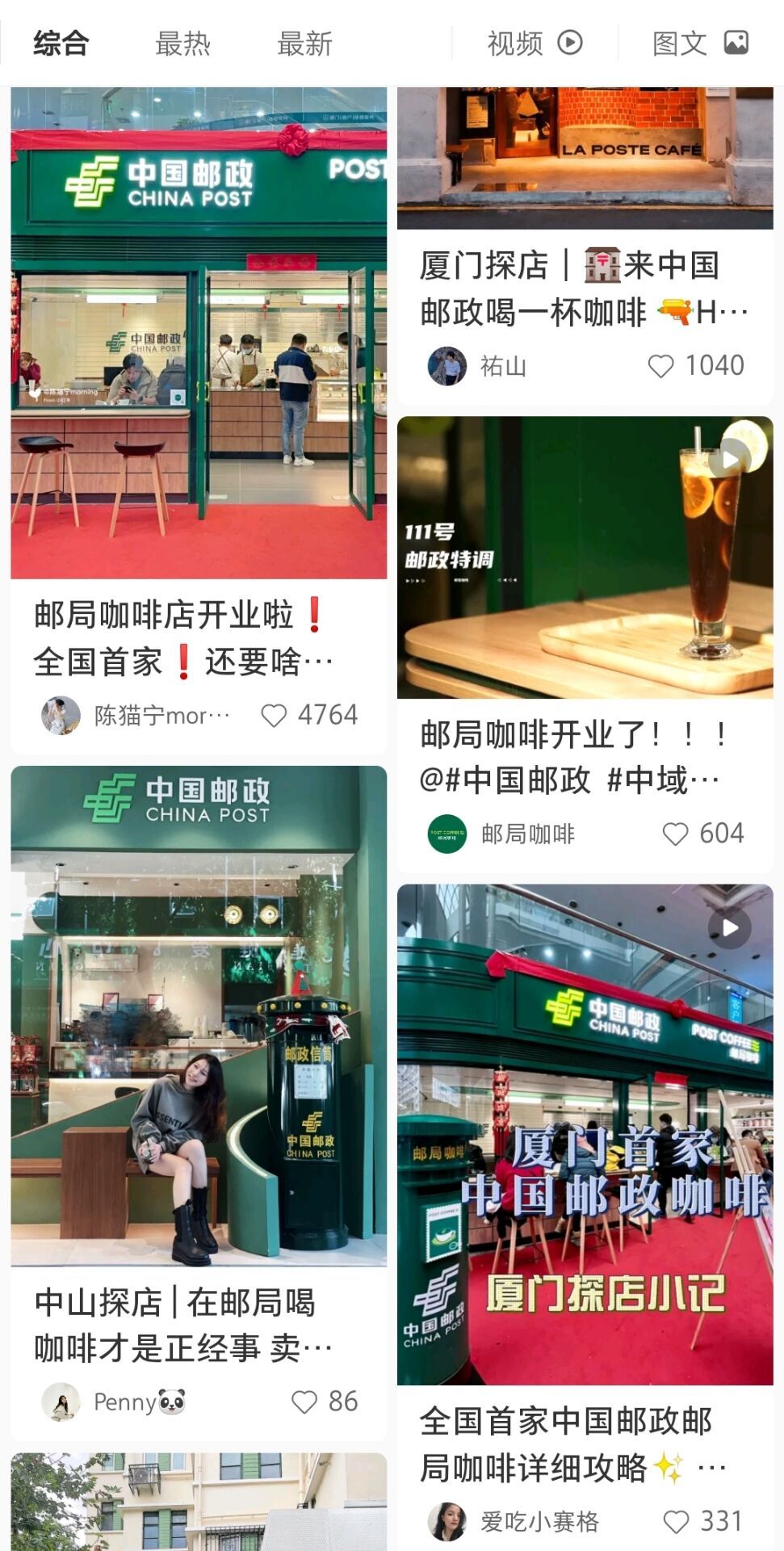 如今,开业不久,邮局咖啡已经成为了妥妥的网红打卡地。在小红书上输入“邮局咖啡”,能够找到3900+篇笔记,甚至邮局咖啡还在小红书上开通了自己的社交账号,收获了网友超2万个点赞。