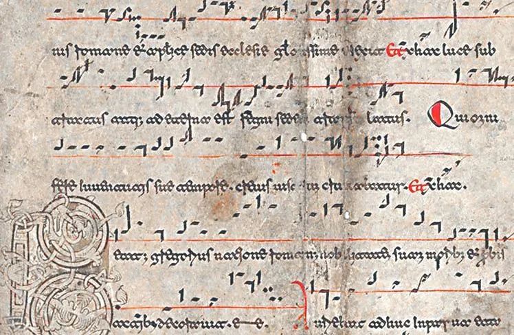 如果没有日臻完善的音乐记谱体系,那么各种研究与探索都不可能实现。曾重点强调过,古典音乐的历史本质上是书面音乐的历史,那么音乐技巧和记谱法的发展也必须是相辅相成的。记谱法不仅记录了新的音乐思想,也是后者得以实现的基础。起初,记谱法主要用于记录圣咏旋律,是种辅助记忆的手段。当时,有经验的歌手需要掌握上千首圣咏,最早的记谱法就是为了帮助歌手记清楚每首需要演唱的圣咏。一系列的记谱符号,或者说这种记录早期音乐的纽姆谱(neumes)其实包含的信息很有限,没有五线谱,也没有制式音符,不可能记录精确的音高、音程,只能用些简单符号来记录大致旋律框架和词句轮廓。