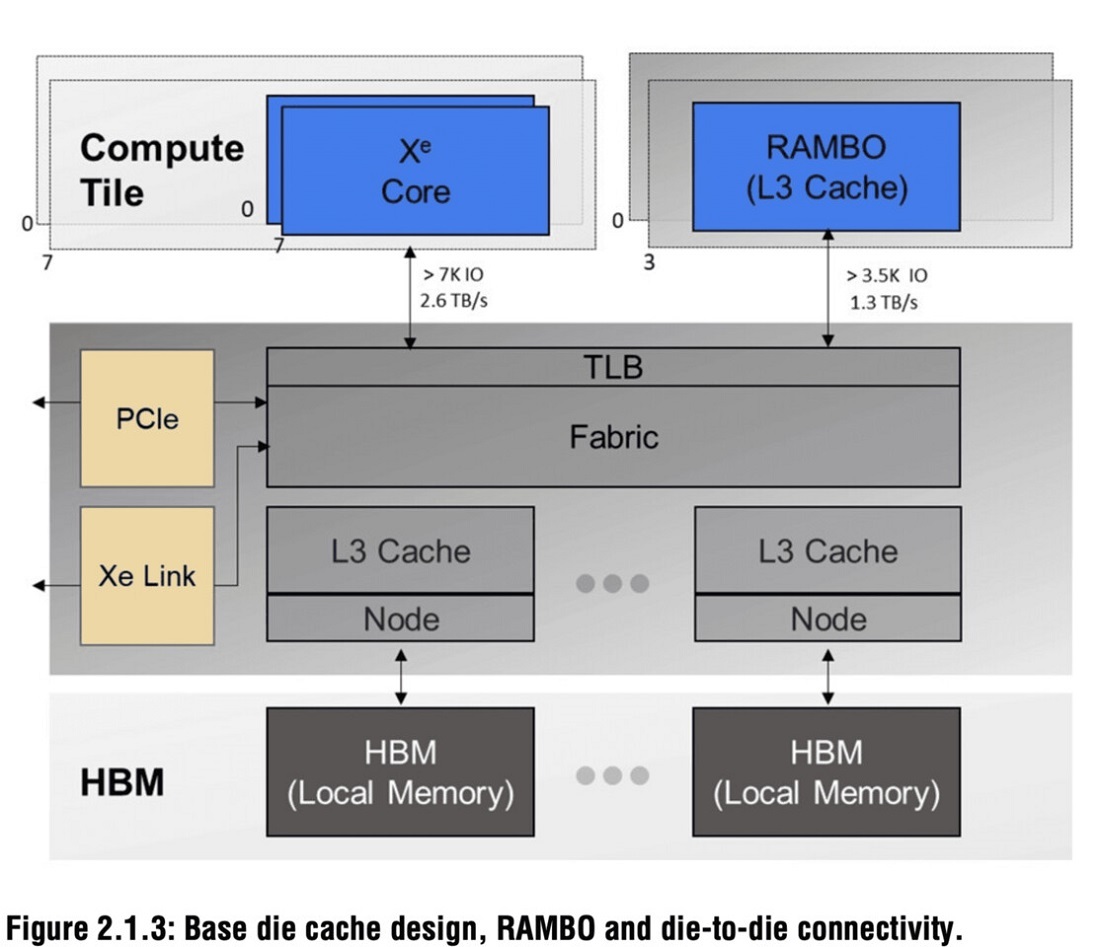 英特尔介绍了Rambo cache的情况,这种新的SRAM技术是由四组3.75MB(共15MB)缓存组成的模块,每个芯片有1.3 TB/s的连接速度,8个Rambo cache芯片可以带来额外的120MB SRAM。Xe基础芯片的面积达到了646平方毫米,总共有17层,其中包含了内存控制器、全集成稳压器(FIVR)、电源管理、以及16通道的PCIe 5.0和CXL接口。