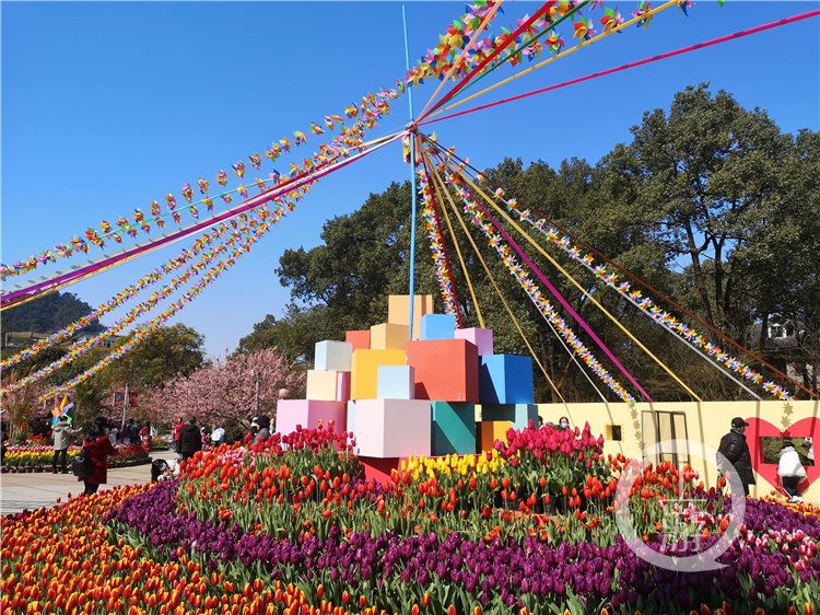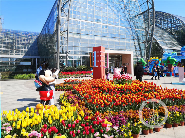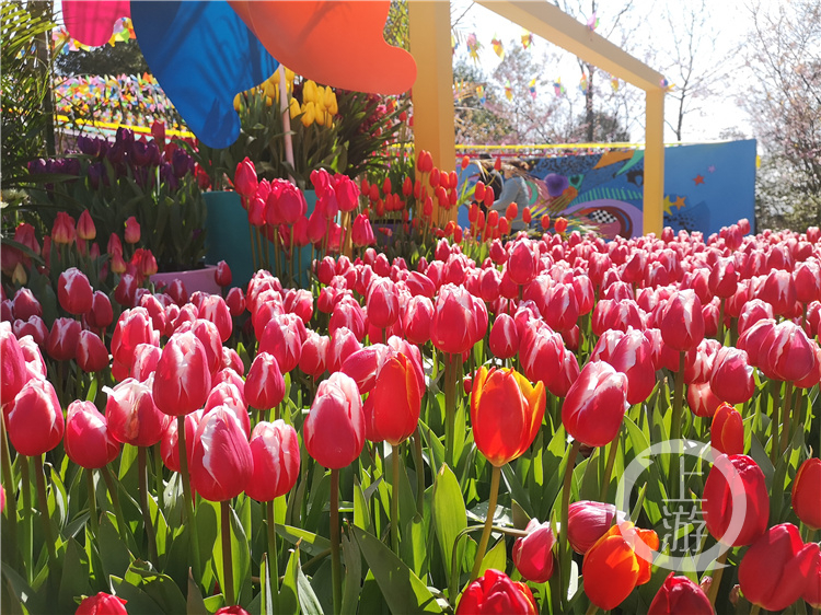 据了解,今年重庆南山植物园郁金香展共展出郁金香品种50个,总数量达20万株。相比往年,本次展览以“爱”为主题,更加突出网红元素在花展中的运用,在广场上设置了网红墙、卡通模型和儿童游乐等项目,让游客置身郁金香花海间,感受拍照打卡的快乐。