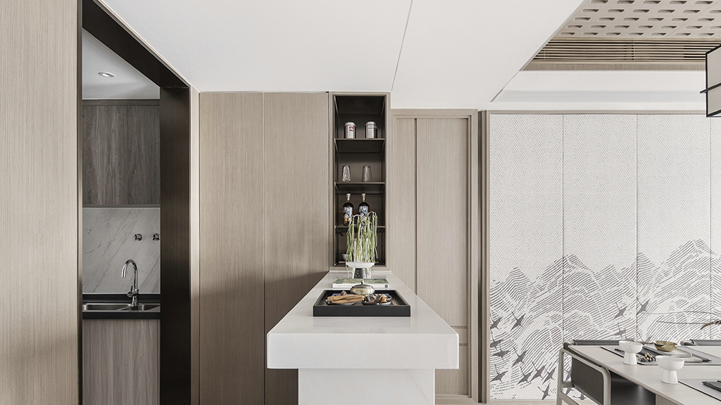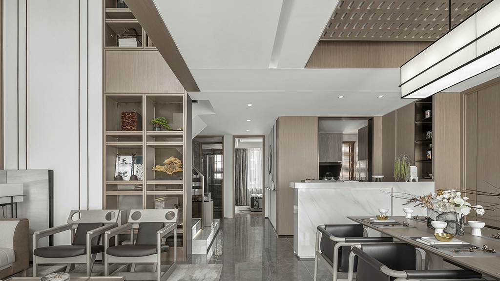 新中式非常注重空间的层次感和跳跃感。在需要隔离视线的地方,采用中式屏风、窗棂、中式木门、工艺隔断、简约的中式博古架等。通过这种新的分离,单元式住宅展现了中式家居的层次之美。在简约造型的基础上,增加了中式元素,使整体空间更加丰富、大而不空、厚而不重、时尚而不压抑。