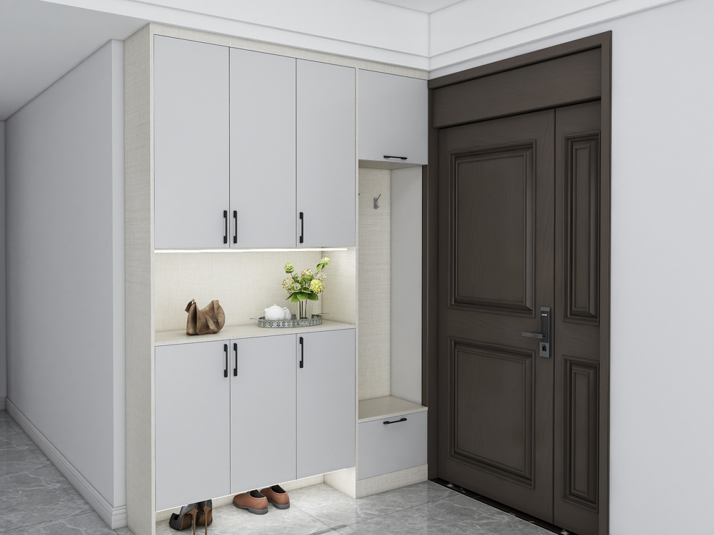 换鞋凳+鞋柜+衣柜是如今比较受业主欢迎的设计方式,有了足够的柜子,我们也能最大限度的收纳。玄关装了鞋柜还能起到遮挡部分外漏电线管的作用,避免裸露在外影响美观。同时也能方便业主进出的,一门到顶的设计,可以方便业主挂置外衣,挂钩区可以存放包包,帽子,领带,皮带等等