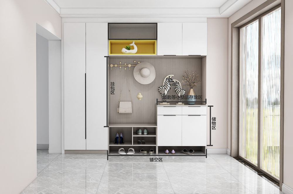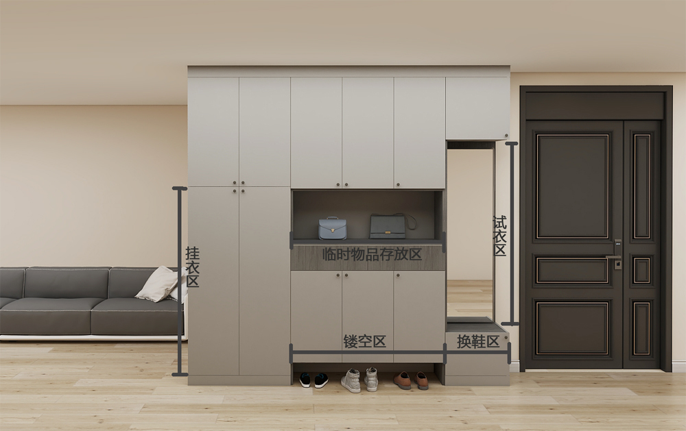 现在大家可以思考一下,进门之处需要放置哪些东西?鞋子,包包,钥匙,雨伞等等可能随身携带的物品,因此在玄关设计时可以考虑定制鞋柜等方式设计。
