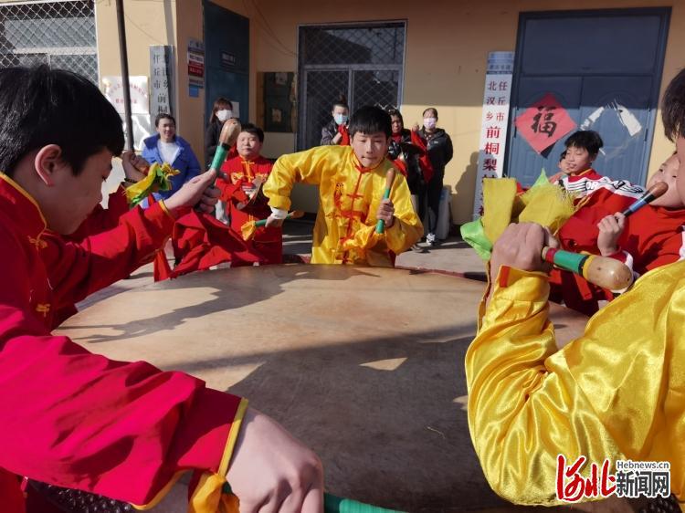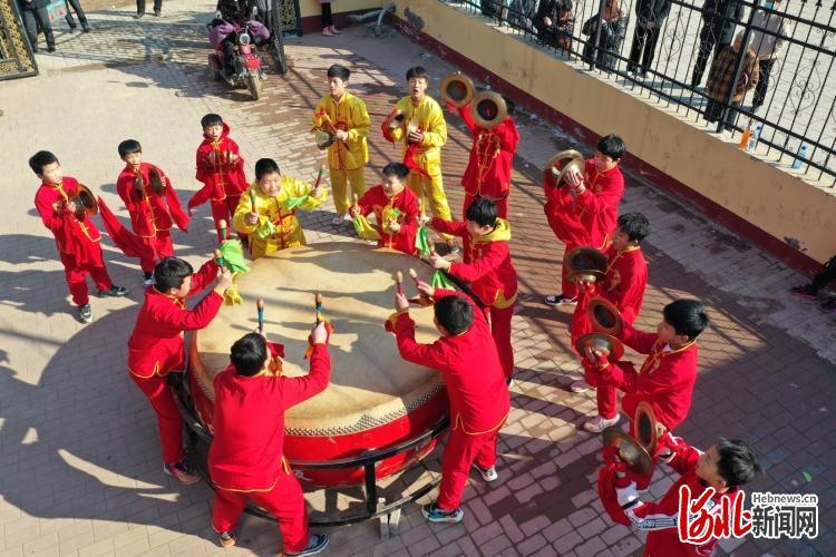 2022年2月23日,河北省任丘市北汉乡前桐梨村的孩子们在学敲任丘大鼓。