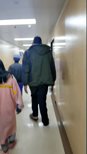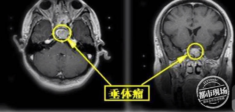 画面中,正在走路的这个高个子就是小明,他的头顶快碰到医院走廊的天花板了,同时他走路有一点迟缓,步子不稳。家属告诉医生,一年前,小明身高1米75,走路也正常,没想到,仅仅一年时间,他就蹿高了35厘米。感觉不太对劲的家属带着小明去了医院,在检查中,医生发现小明的脑部有一个巨大的垂体瘤。
