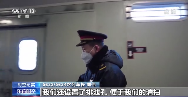 5633/5634次列车长 刘伟:我们这个行李车是2017年进行的改装,为了方便(车厢)空气的流通,设置了14个天窗,这里有一个拴挂处,大型牲畜上来把它拴挂在这里。为了安全,我们还设置了排泄孔,便于我们的清扫。