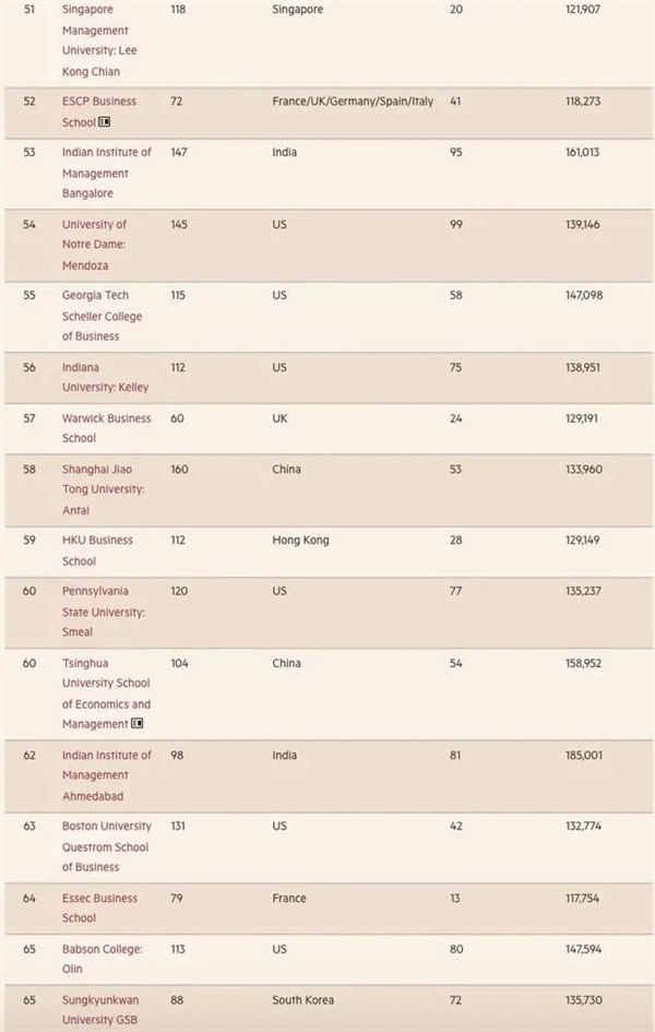 其次是复旦大学管理学院(32),北京大学光华管理学院(42),上海交通大学安泰经济与管理学院(58);清华大学经济与管理学院(60)。