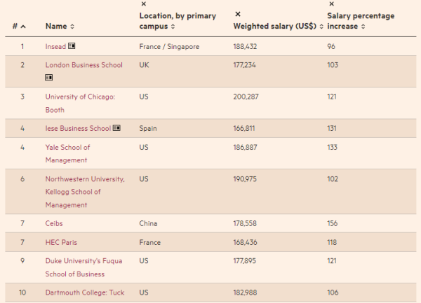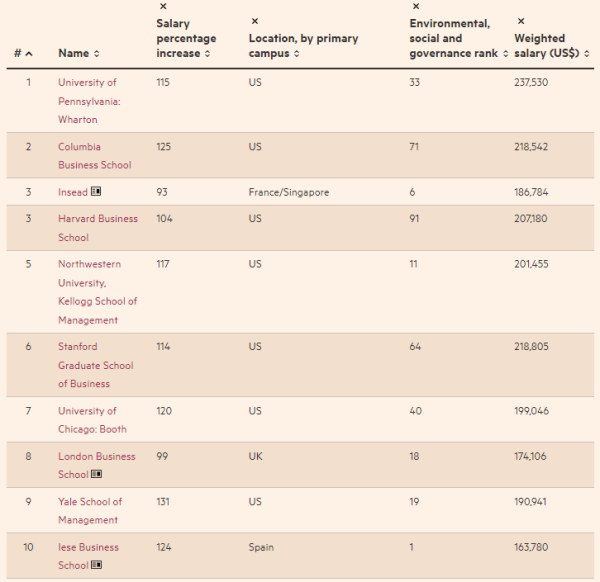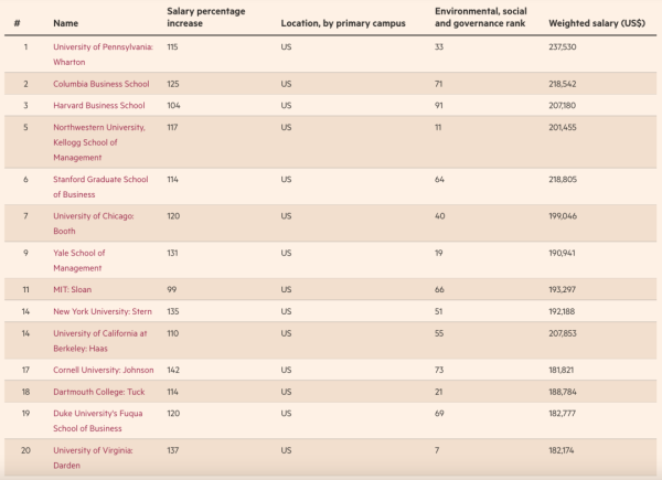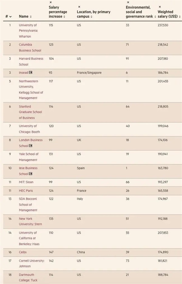 其中沃顿商学院自《金融时报》发布排名以来,首次登上榜首,位列第一名!