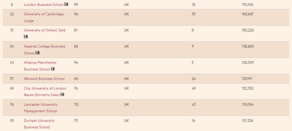 而且大家耳熟能详的那些顶尖商学院几乎都榜上有名,包括:伦敦商学院LBS(8)、剑桥大学贾奇商学院JUDGE(22)、牛津大学赛德商学院SAID(31)、帝国理工学院IC(34)、曼彻斯特商学院(43)、华威商学院(57)、伦敦大学城市学院贝叶斯商学院BAYES(69)、兰卡斯特大学管理学院(76)、杜伦大学商学院(95)。