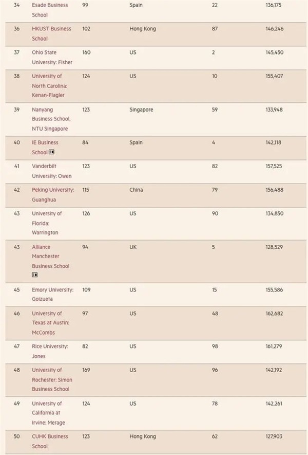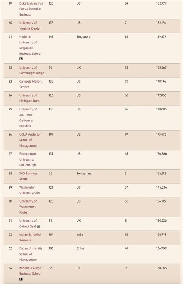 分别是麻省理工斯隆商学院(11)、纽约大学斯特恩商学院(14)和伯克利哈斯商学院(14)、康奈尔大学商学院(17)、达特茅斯塔克商学院(18)、杜克大学商学院(19)、弗吉尼亚大学达顿商学院(20)也都取得了非常不错的成绩,全部进入TOP20。