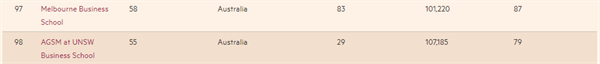 分别是墨尔本大学商学院(97),比去年下降10位;及新南威尔士大学商学院(98),比去年下降19位.