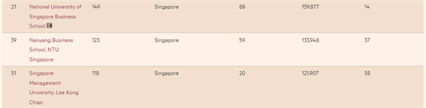 分别是新加坡国立大学商学院(21),比去年下降7位;南洋理工大学商学院(39),比去年下降2位;以及新加坡管理大学李光前商学院(51),比去年提升7位。