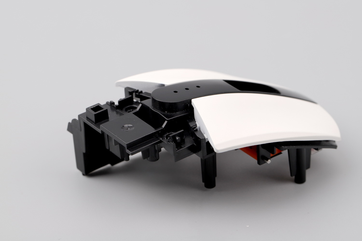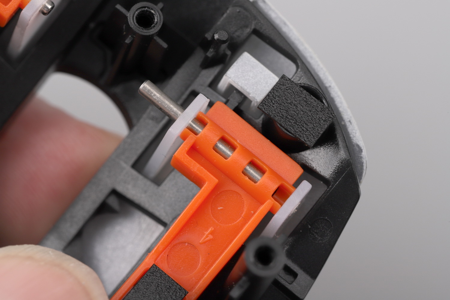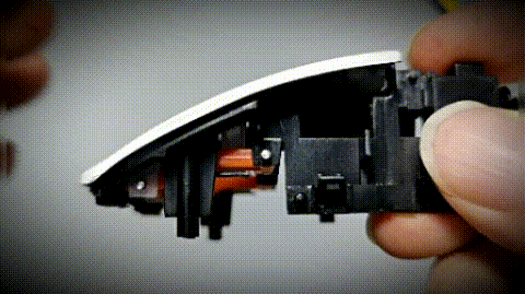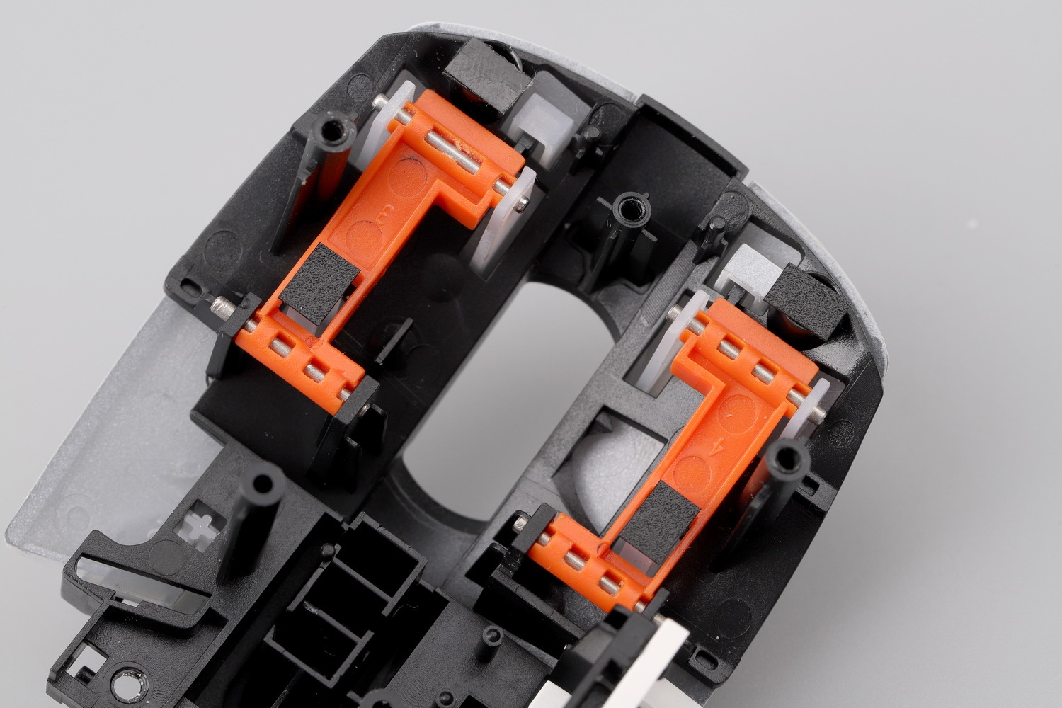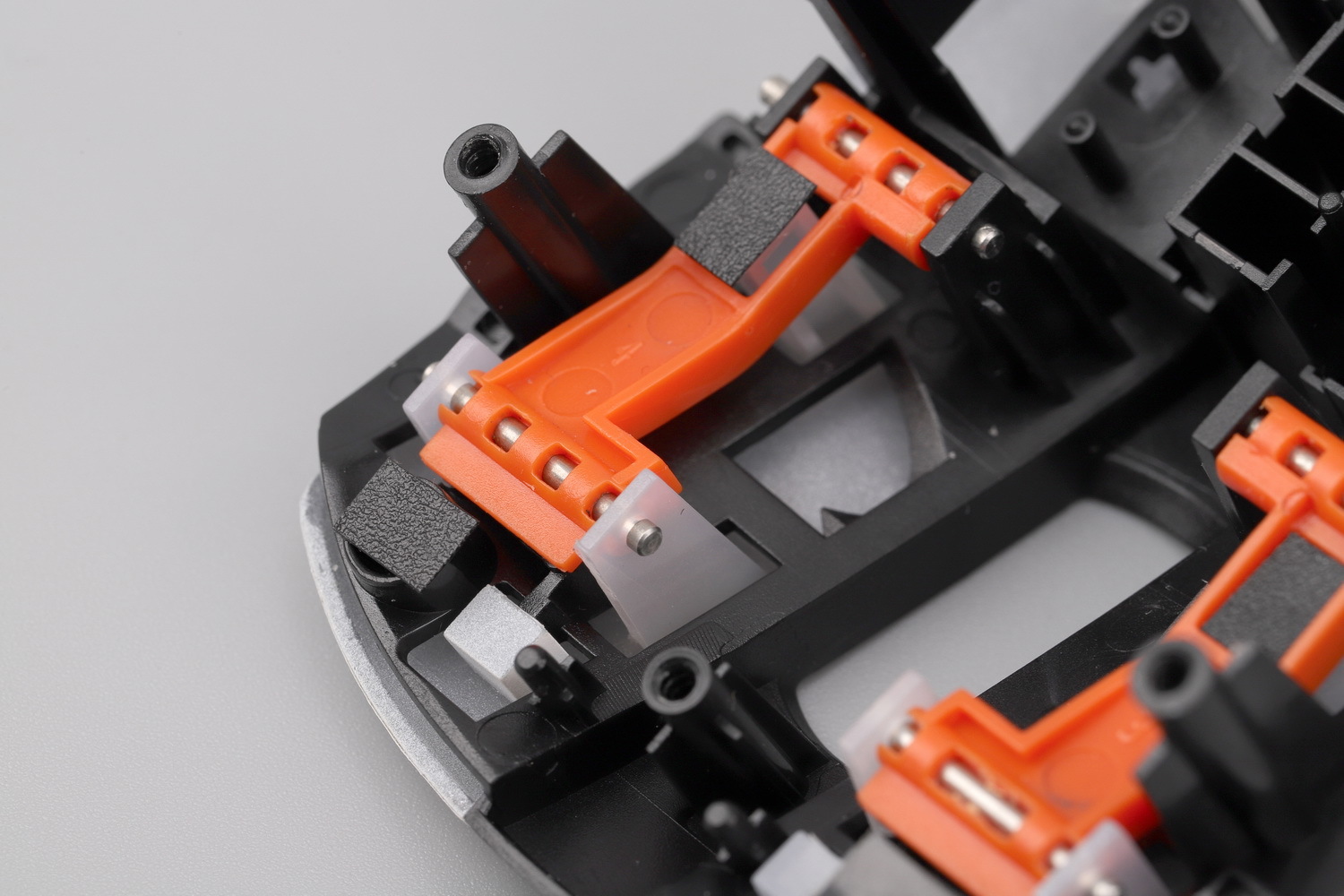 把按键模块翻过来,这就是KBS 3.0系统,此款鼠标的一大亮点所在。一对橙色POM(自润性好转动阻力更小)材质的悬臂,前后两端各有一根钢轴穿过黑色基座和白色按键,形成一个双头轴式的联动结构,并把按键柱(触发点)置于悬臂之间的某个点。