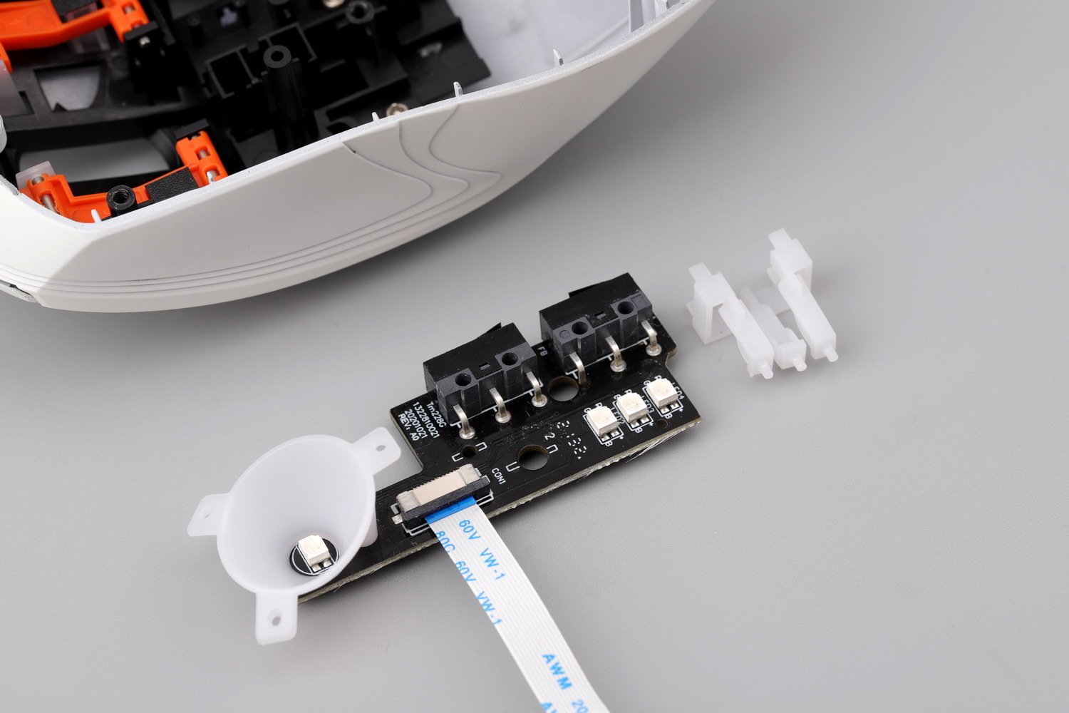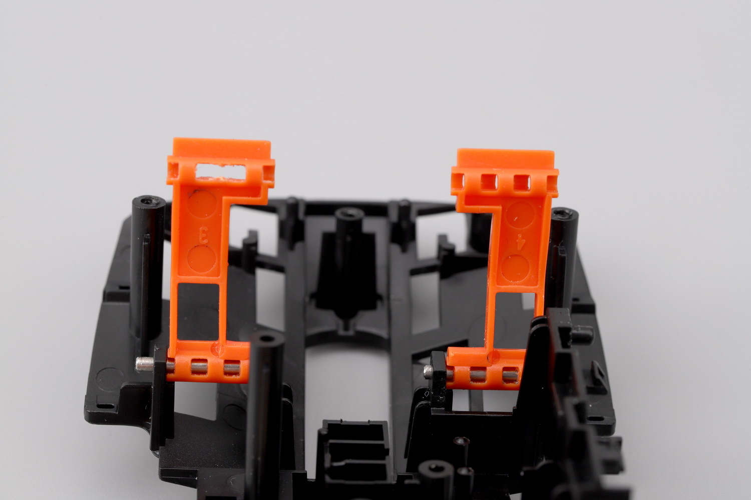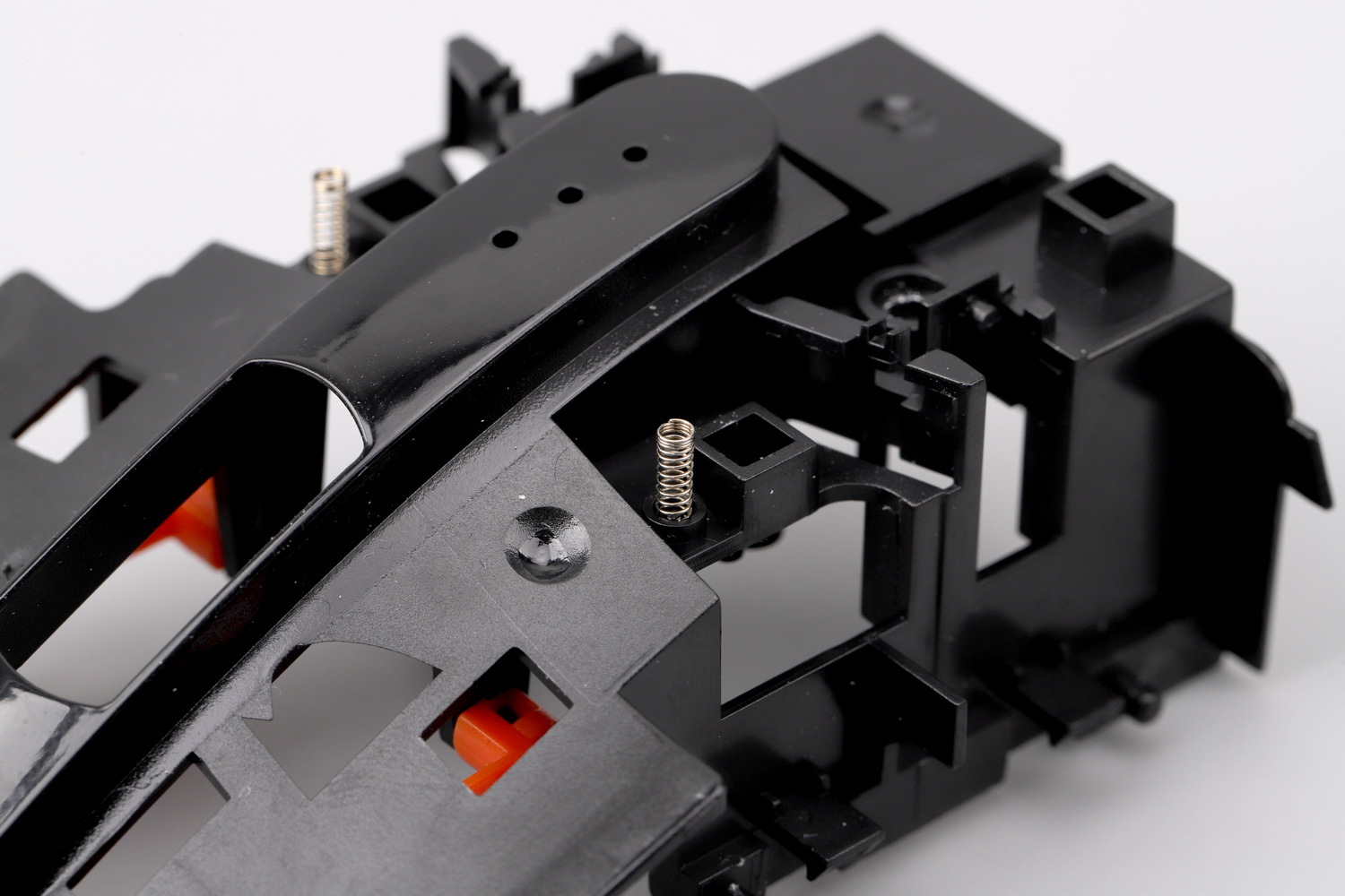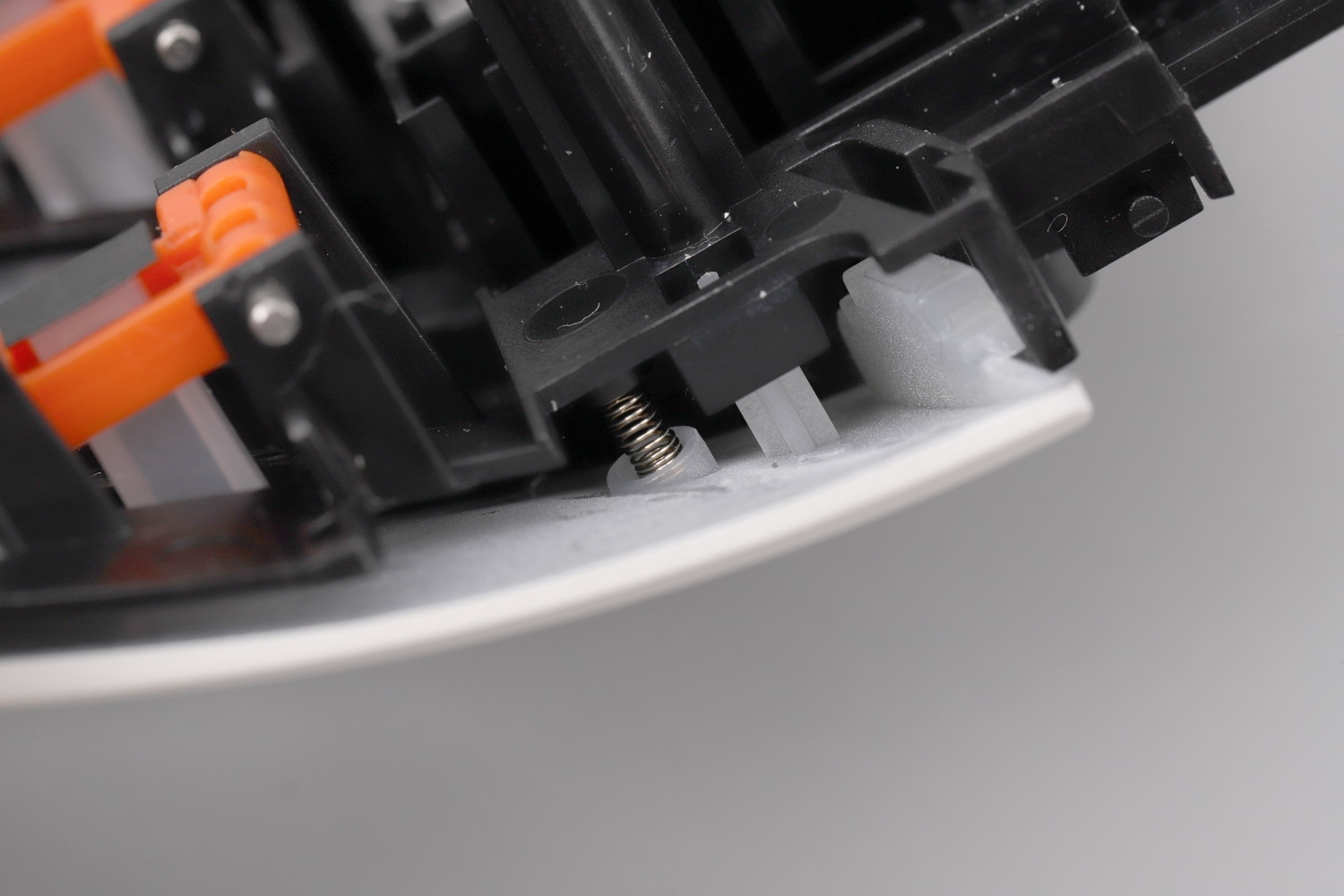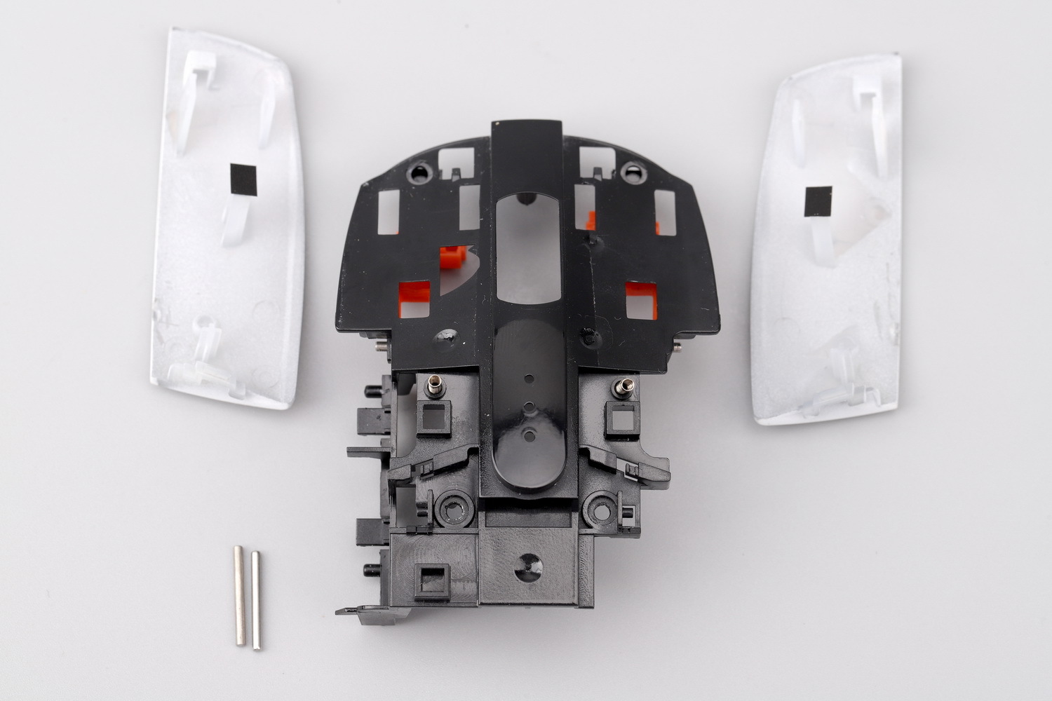 把按键模块翻过来,这就是KBS 3.0系统,此款鼠标的一大亮点所在。一对橙色POM(自润性好转动阻力更小)材质的悬臂,前后两端各有一根钢轴穿过黑色基座和白色按键,形成一个双头轴式的联动结构,并把按键柱(触发点)置于悬臂之间的某个点。