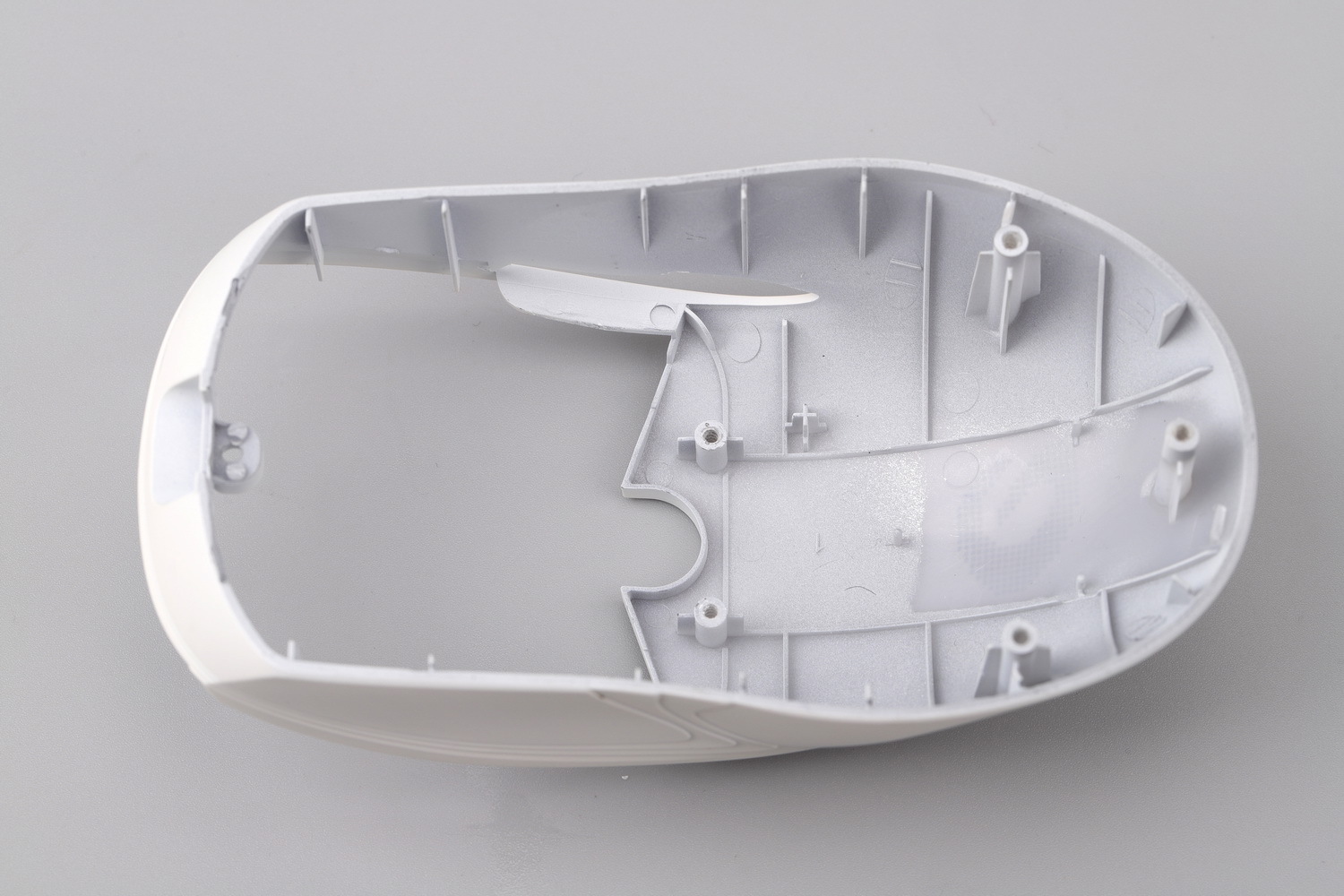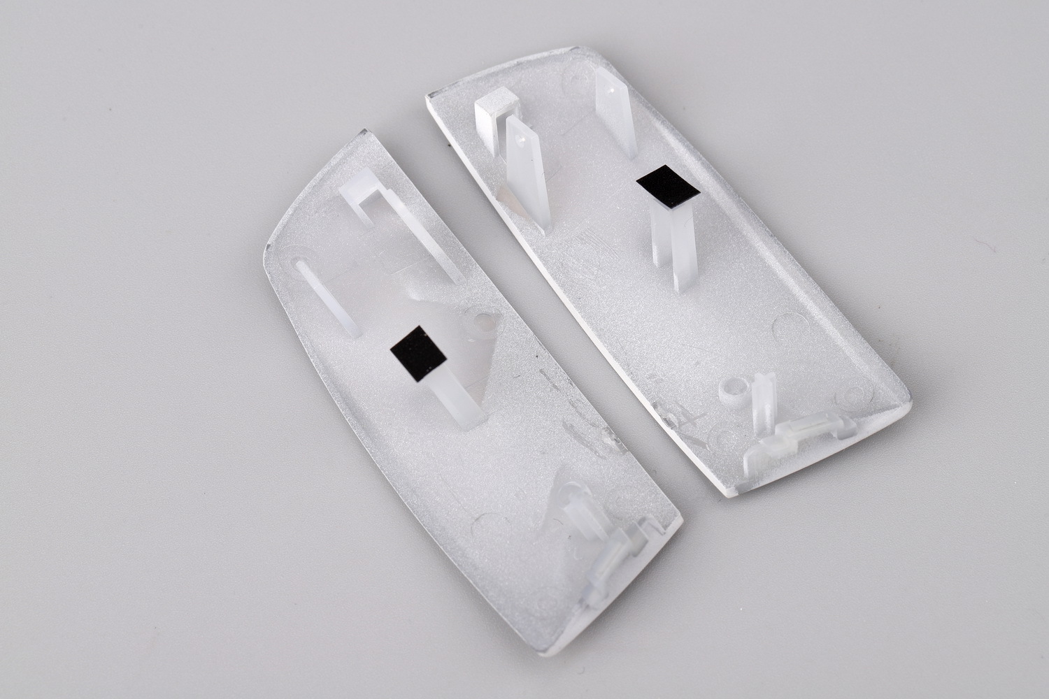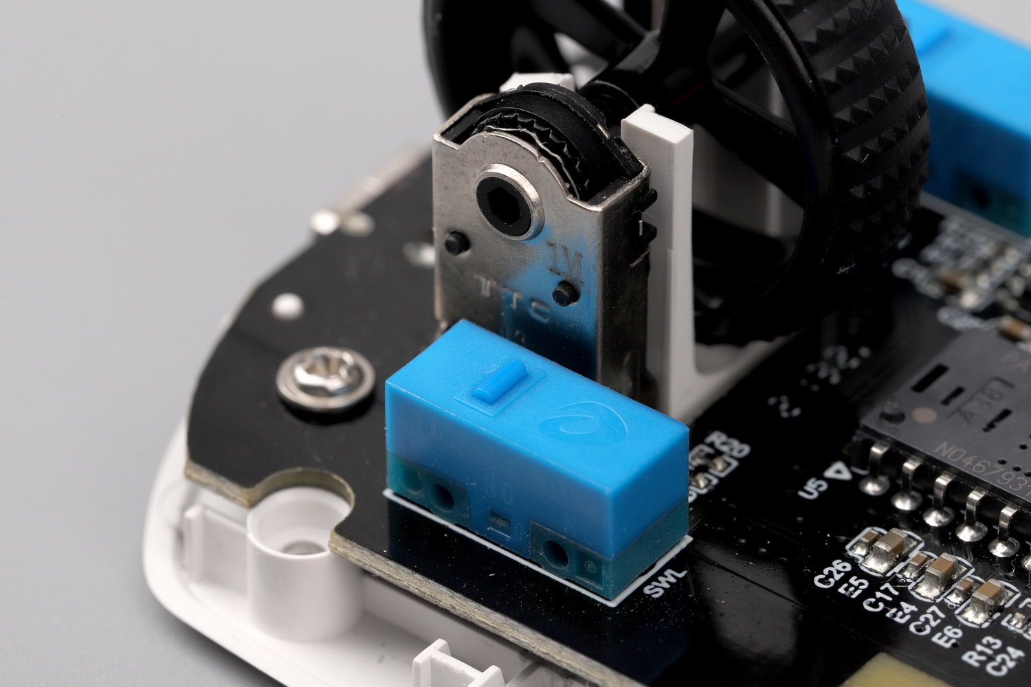 我们把悬臂取下来,继续拆按键会把这个结构看得更明白。左、右按键片比一般鼠标多了一对基座用来连接悬臂,同时它的首尾有相应的限位结构,能确保按键连续触发时的稳定和高效,按键击柱上增加了耐磨垫片,因为是样机,垫片的厚度和面积不太准确。