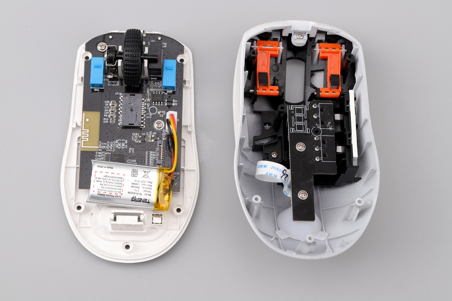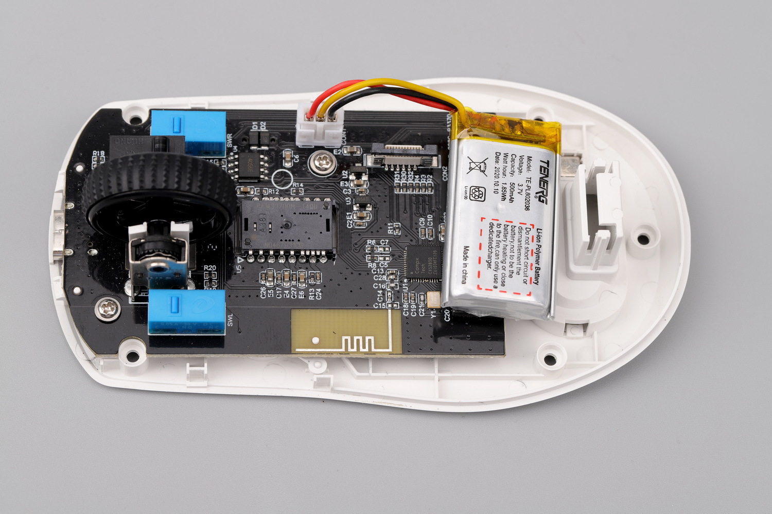 相比按键系统,底盖和主板就相对直观了,A900采用黑色方形PCB板,尾部带收纳槽,零部件比较靠前,再通过500mAh的锂电池的较大重量来平衡首尾,确保重心位置居中。