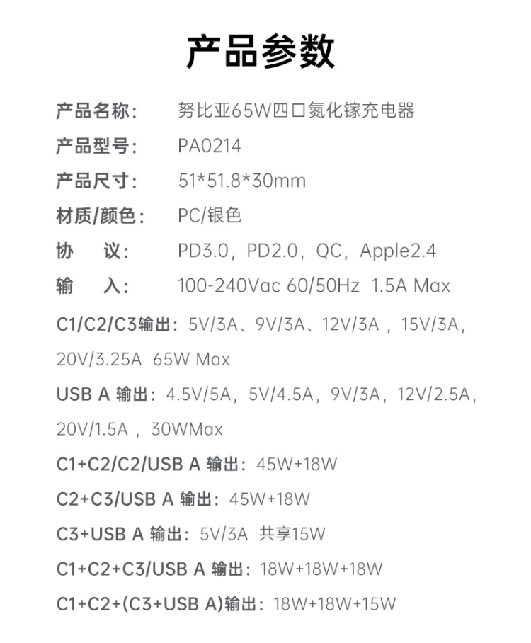 IT之家了解到,该充电器采用折叠式插头设计,体积小巧,采用第三代超频技术,连续 65W 满负工作 2000 + 小时不伤机。采用 3C1A 四口设计,搭载 Neocharge 快充技术,动态分配功率,不用区分快充插口,C 随意一个最高输出可达 65W。兼容 PC / QC / SCP / FCP / AFC 等主流快充协议,可为笔记本快速充电,90 分钟充满 Macbook Air 13。