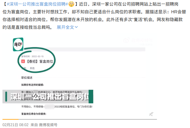 近日,深圳一家公司在公司招聘网站上贴出一招聘岗位为“盲盒岗位”,主要针对想找工作,却不知自己更适合什么岗位的求职者。