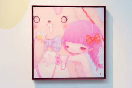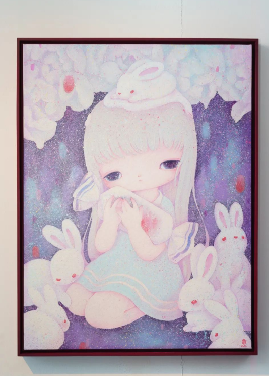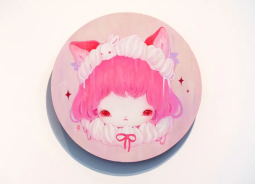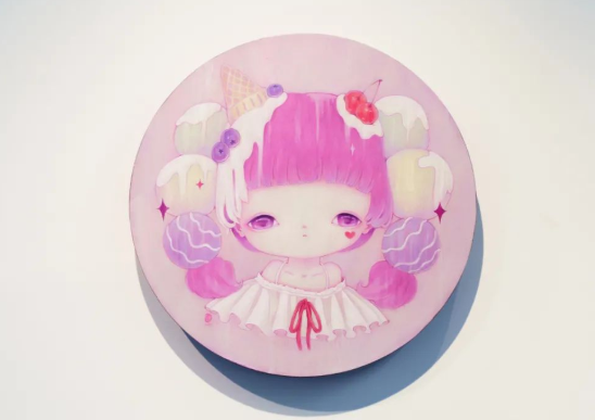 一舒:这是一个用糖果和梦想建造的甜味游乐园。鲜艳明亮的色调,甜美可口的奶油,可爱活泼的小动物和娃娃们,组成了一个琳琅满目的幻境,充满着喜悦和诱惑。这里有无限的甜品蛋糕,有陪伴她的可爱的小动物们,还有暖绒绒的娃娃们,这里仿佛是一个理想的国土。但是世界上并没有一个地方可以让快乐持续。作品中也有暗示这一点的地方,比如融化掉的奶油流淌着,就像一去不复返的时间,快乐来了又走。虽是这样,一个可以暂时给心灵提供慰藉的避风港还是美好的,让身心可以得到休息和充能。追求美好就是人的本性。我邀请大家和我一起走进这样的世界,希望可以给大家带来一些治愈和能量。