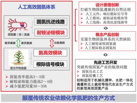 文章强调,人工高效生物固氮技术采用合成生物学模块化概念和系统设计理论,打破生物固氮反应遵循的自然法则,克服生物固氮体系的天然缺陷,突破传统固氮技术田间应用效率低下、应用效果不稳定等产业瓶颈问题,创建人工高效生物固氮体系并实现节肥增产增效的田间示范应用,为现代农业生产提供一种节能低碳、生态友好的生物供氮途径,将完全颠覆过度依赖化学氮肥的传统农业生产方式。