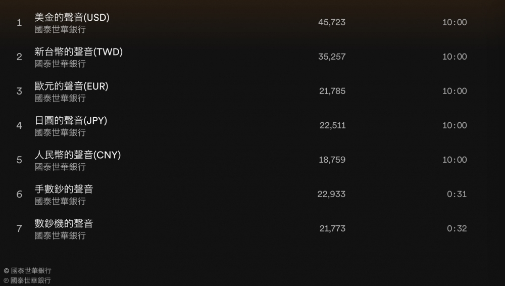DoNews 2月24日消息(刘文轩)台湾的国泰世华银行在各大音乐平台上传名为《Gold Noise》的专辑,里面包含各种货币的“数钞声”搭配具有当地风情的背景音乐,以及单纯的“数钞声”,共 7 首“曲目”。
