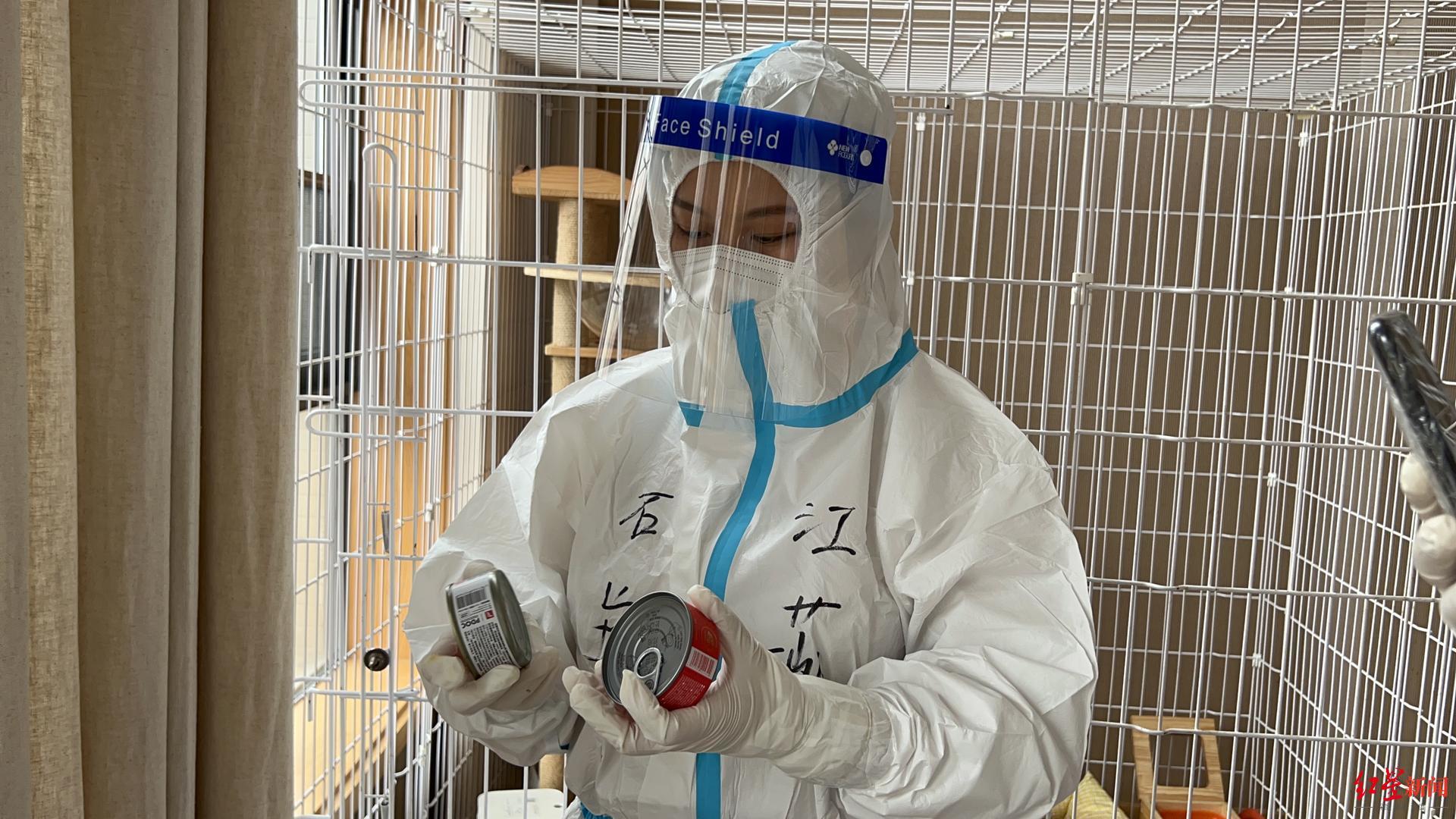 主人出门旅游,小区封控后,家中3只宠物猫无人照看。成都高新区石羊街道锦城社区工作人员了解到这一情况后,安排专人上门查看。防疫人员当起了“铲屎官”,帮三只猫换了猫砂,水盆里更换了干净的饮用水,放上了新鲜的猫粮猫罐头。