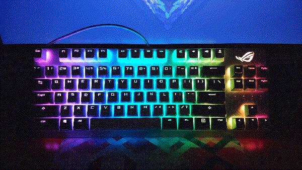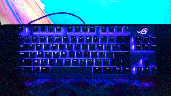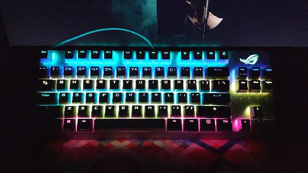 连通键盘与电脑,当RGB灯效亮起后,充满战斗气息的电竞氛围立刻就出来了,尤其是键盘下侧边那处可以投射到桌面的RGB灯带,效果真的是拉满了,要问RGB灯效的沉浸感是什么样子,那ROG游侠NX TKL可能就是答案。