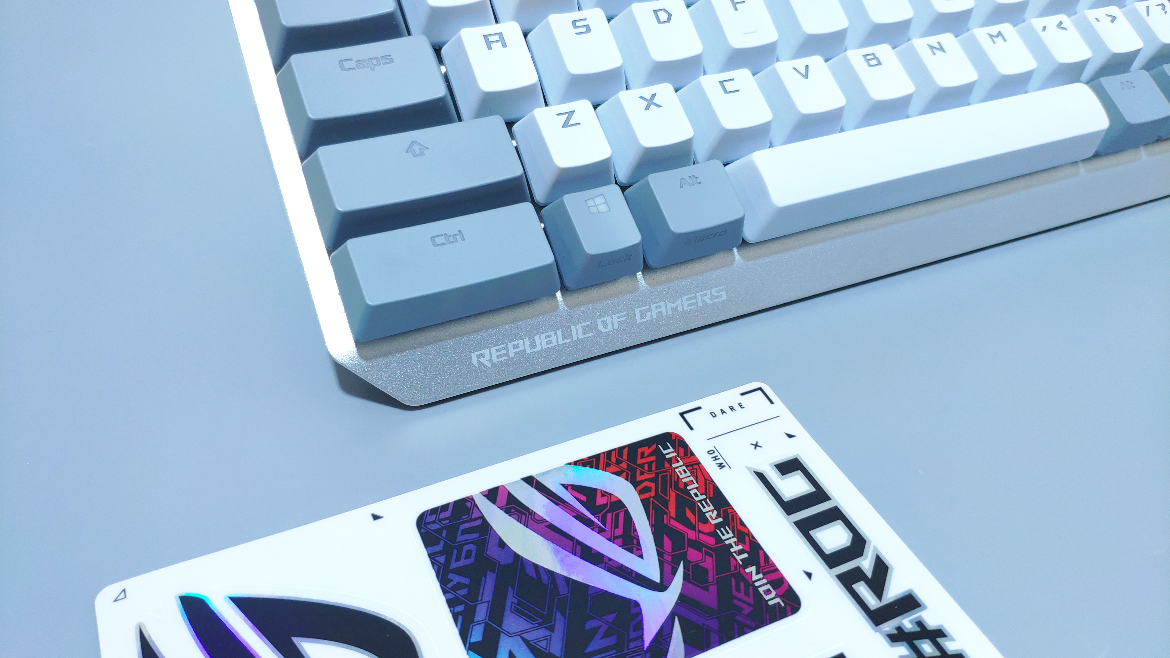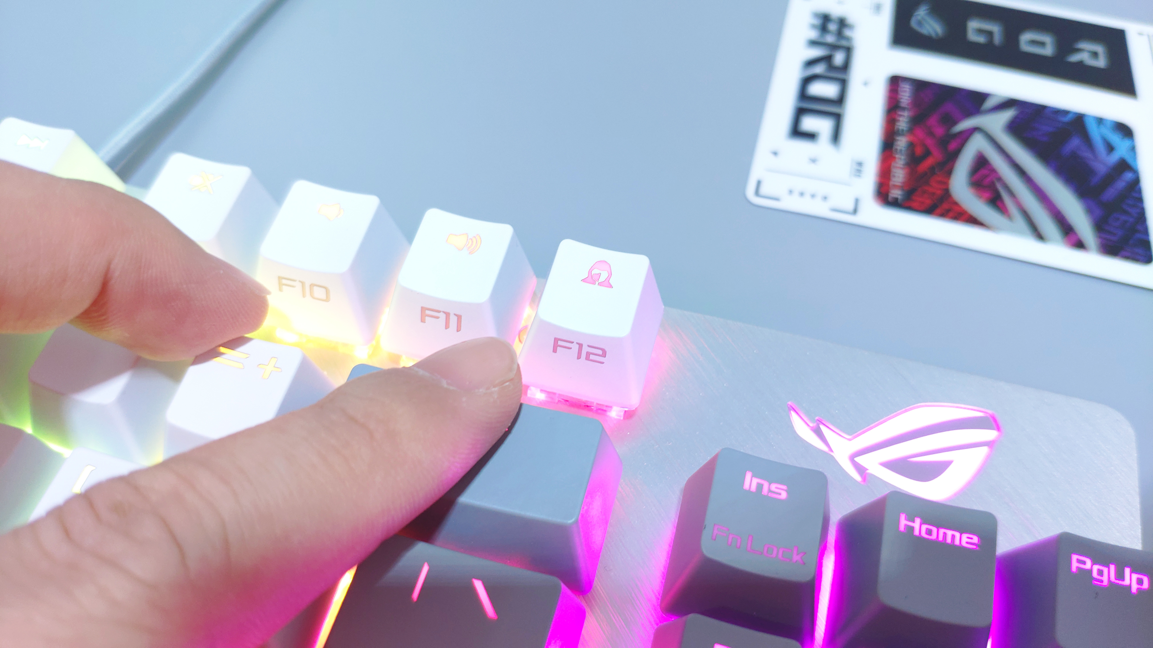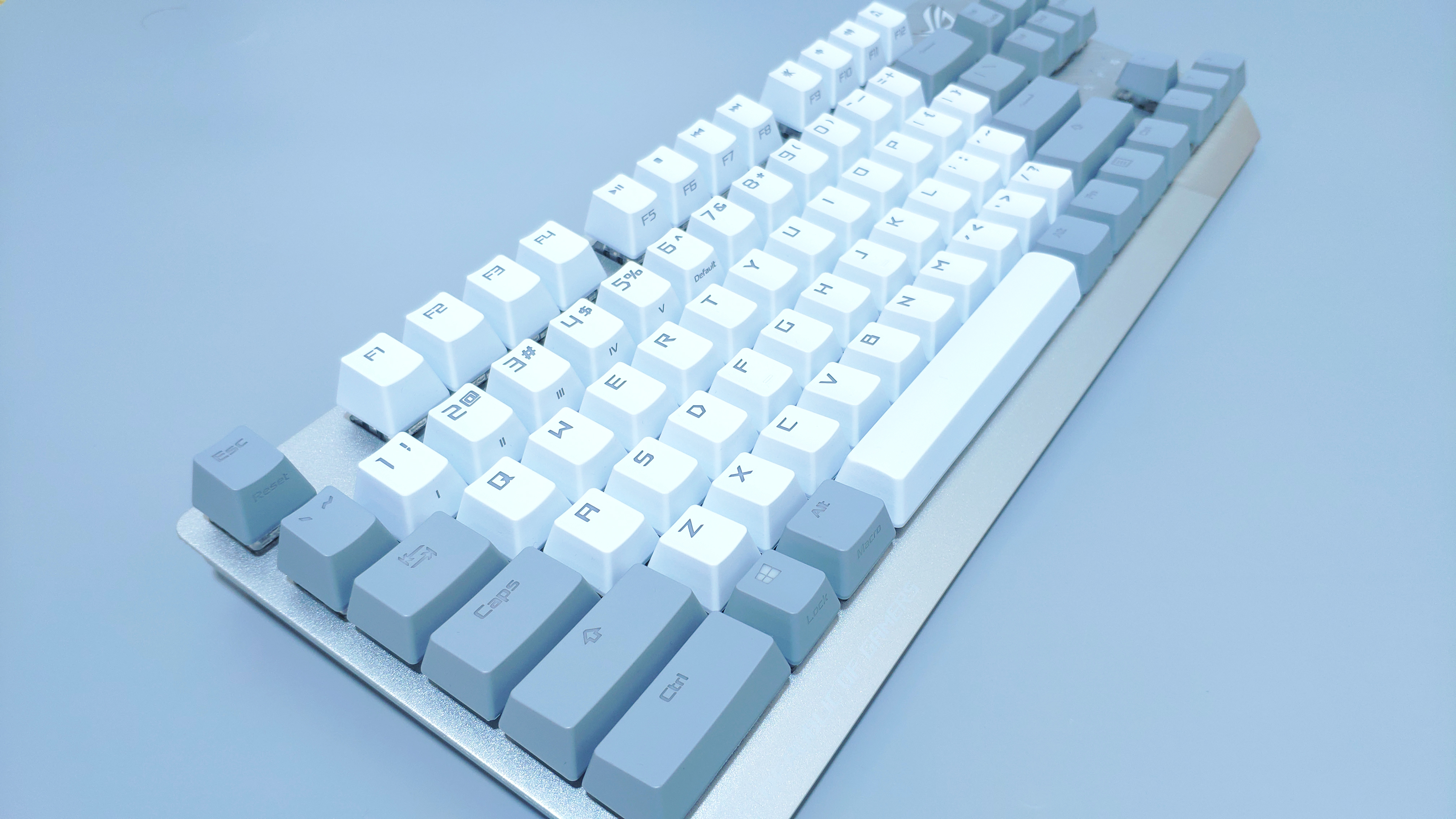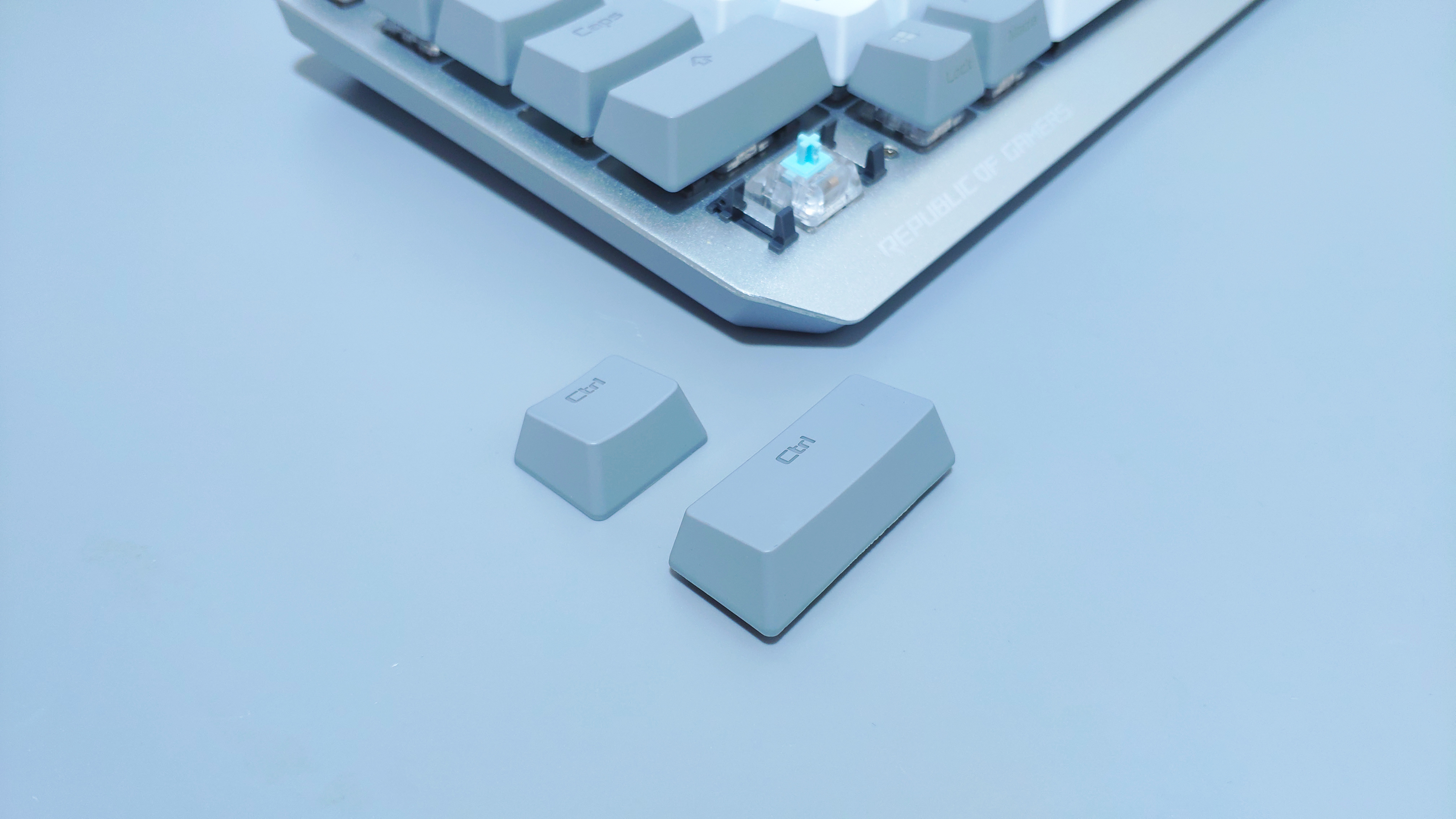 键帽的配色如图为深灰+白,与ROG游侠NX TKL月耀白搭配相得益彰,材质是ABS,应该是为了配合FPS玩家进行强力输出,ROG游侠NX TKL按键特别有一长一短的设计。
