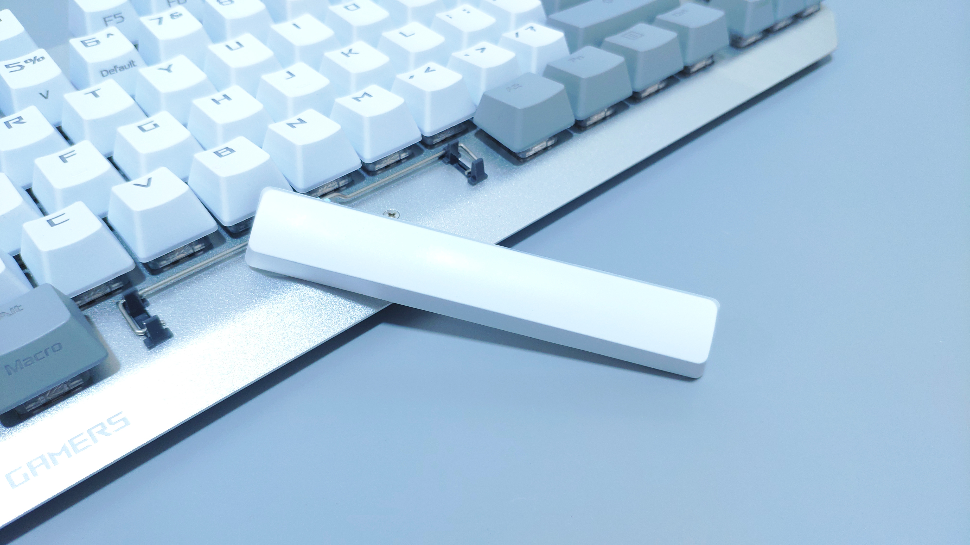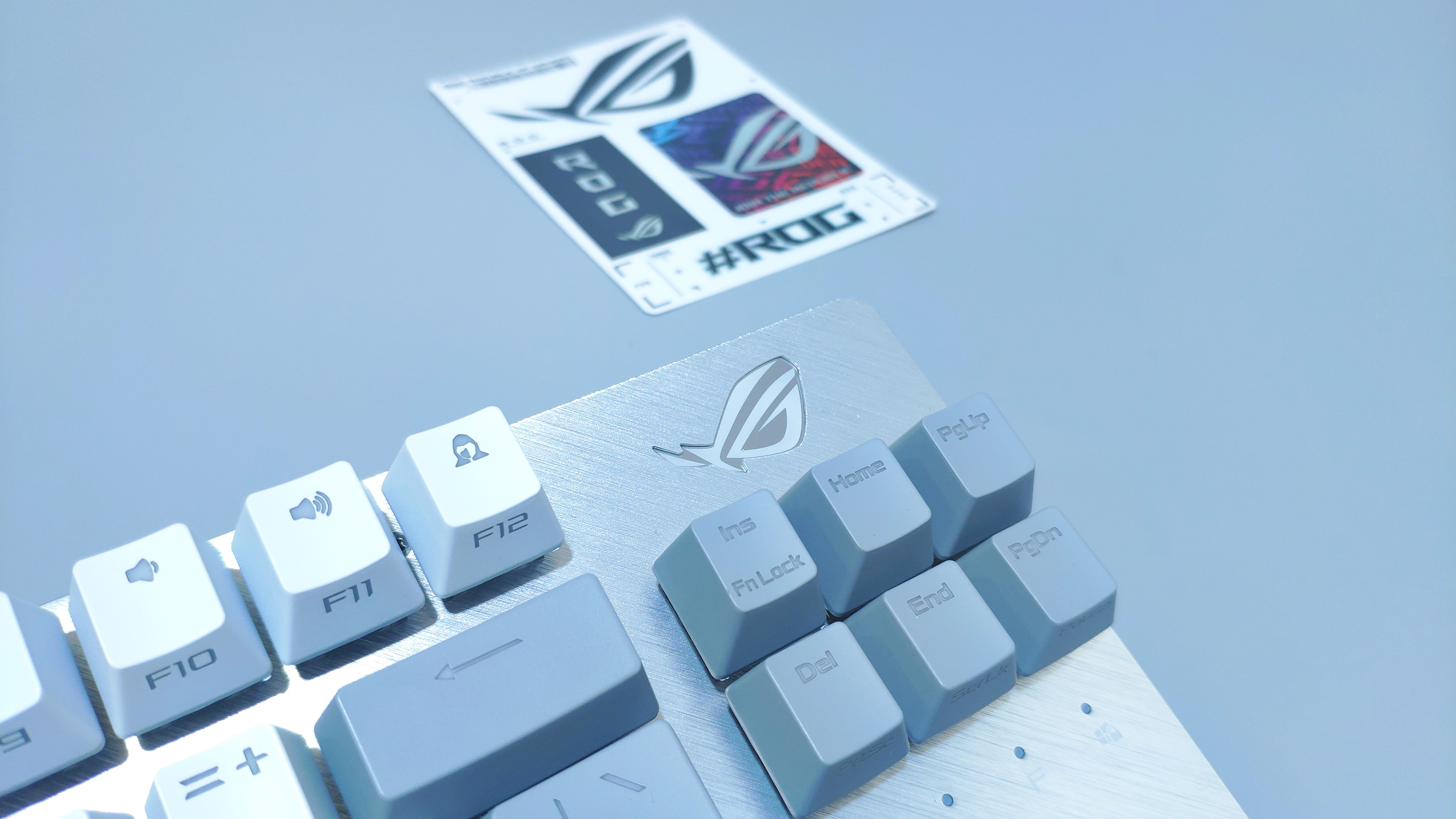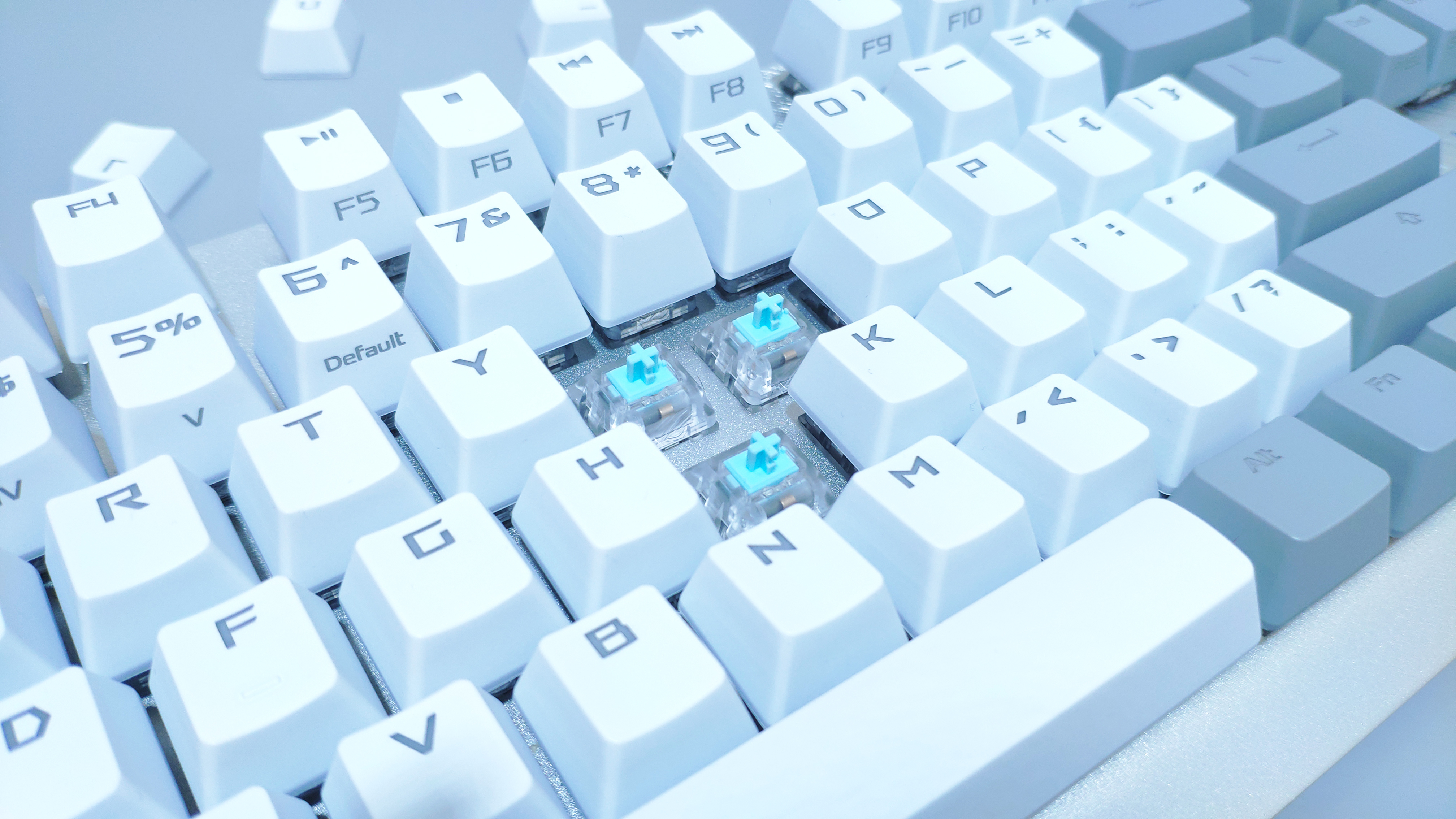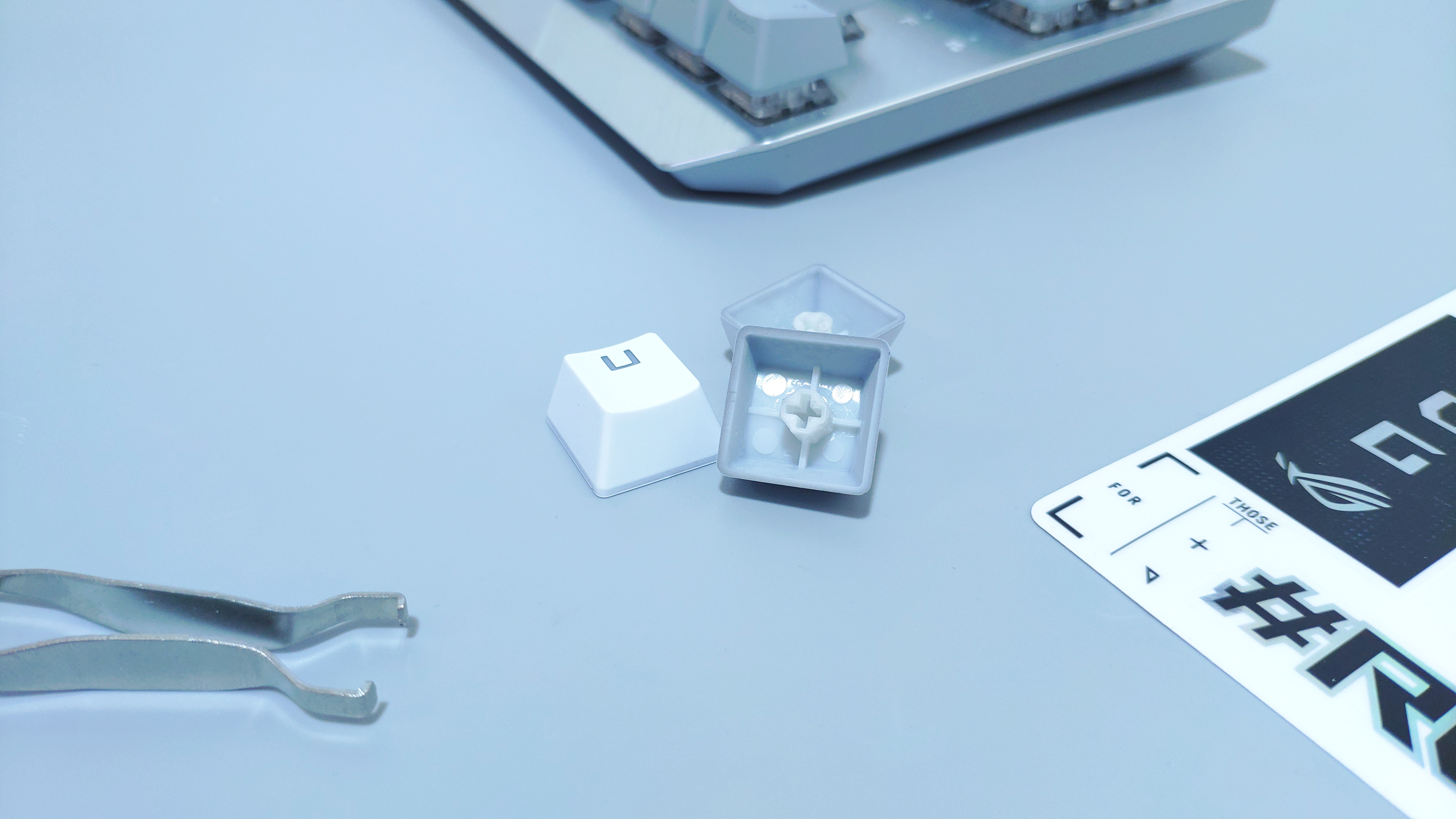 键帽的配色如图为深灰+白,与ROG游侠NX TKL月耀白搭配相得益彰,材质是ABS,应该是为了配合FPS玩家进行强力输出,ROG游侠NX TKL按键特别有一长一短的设计。