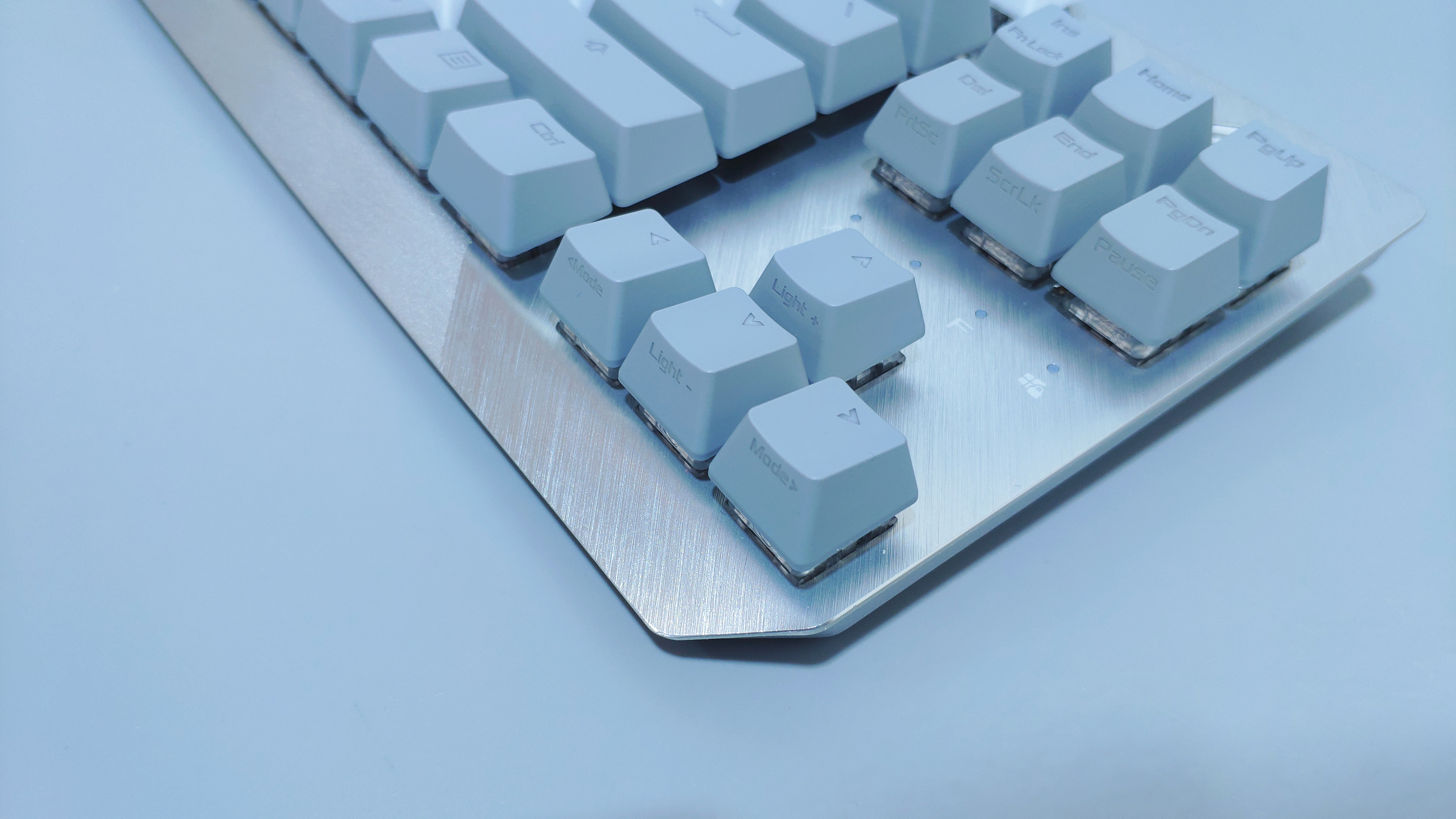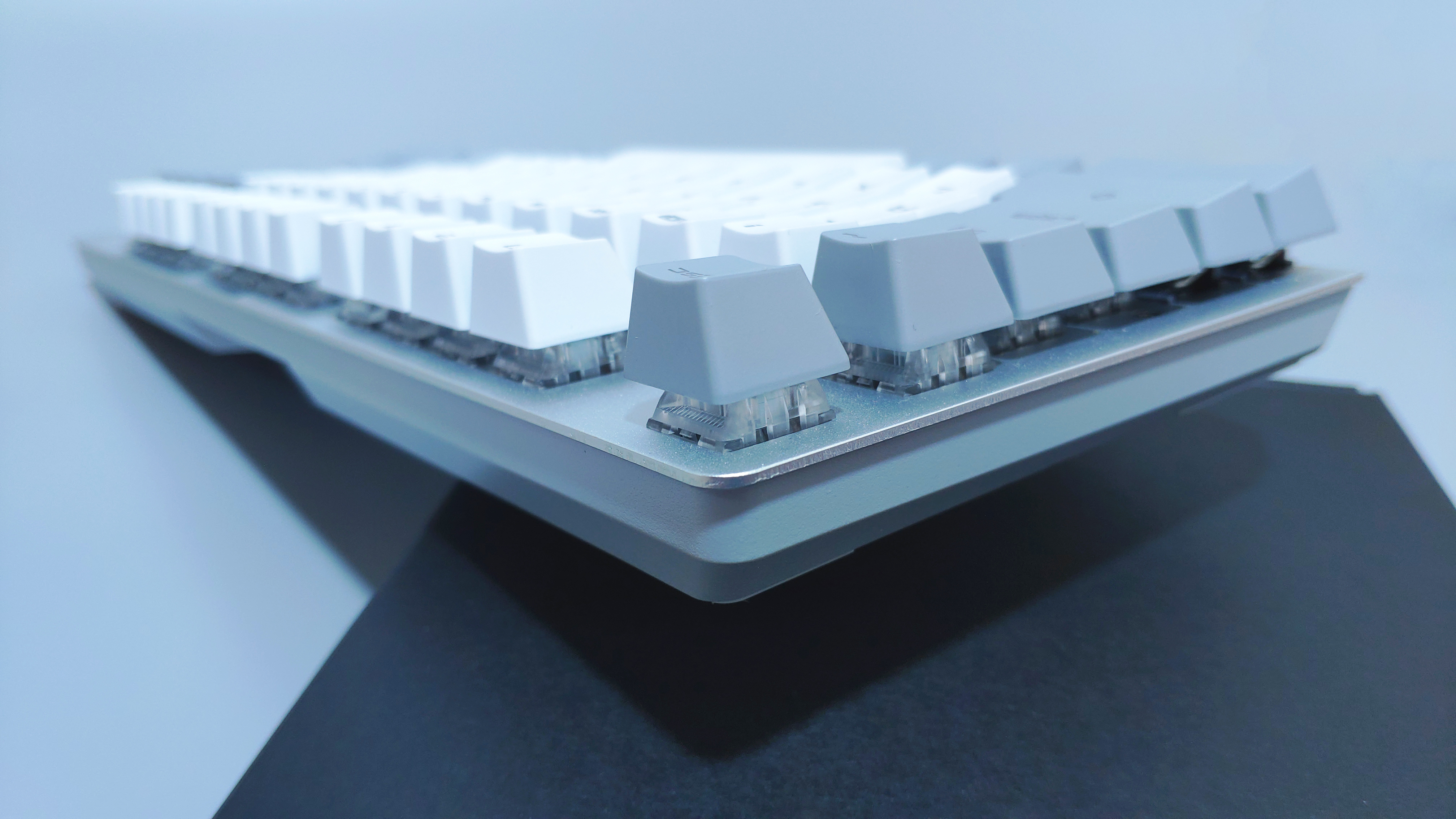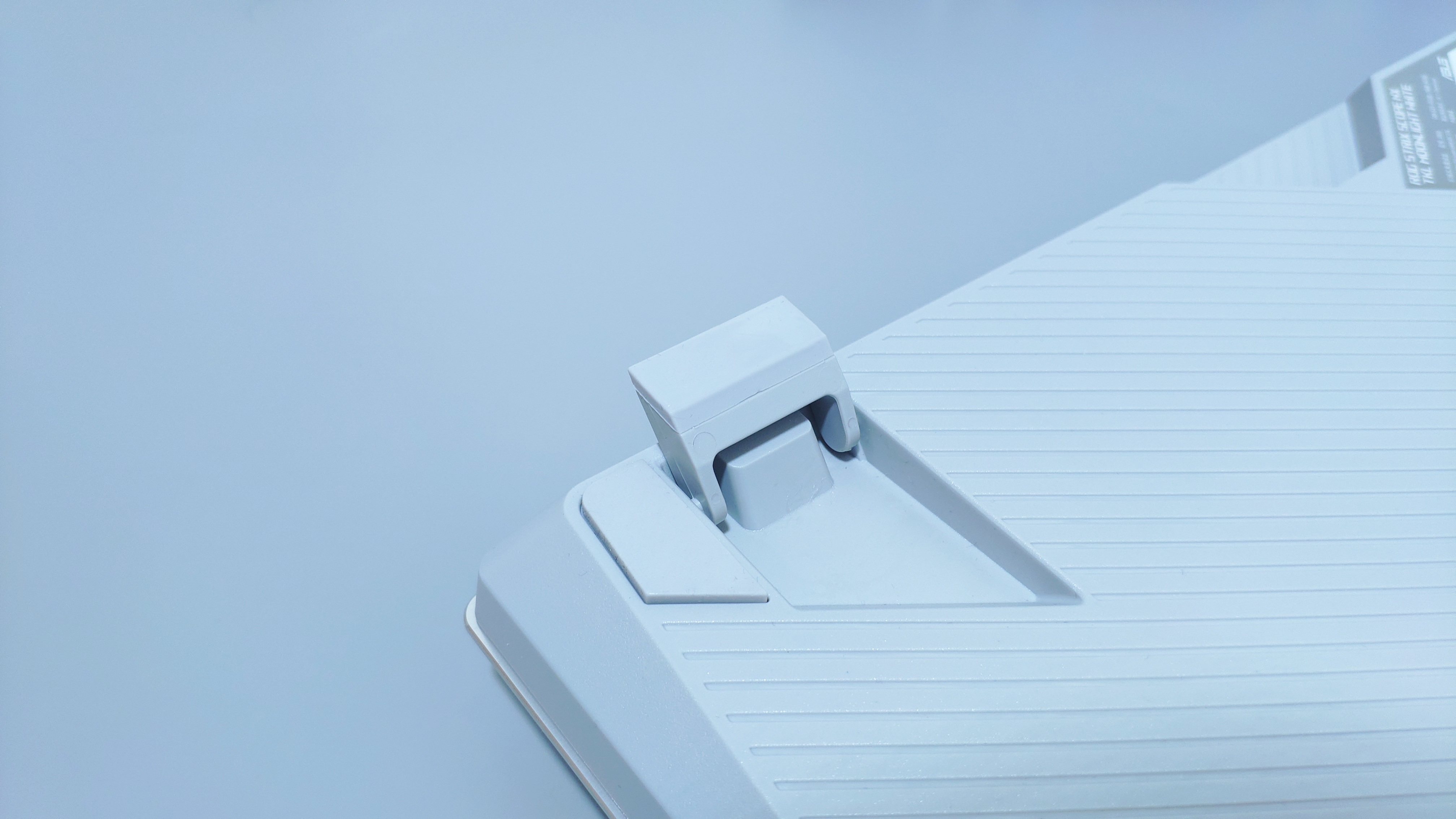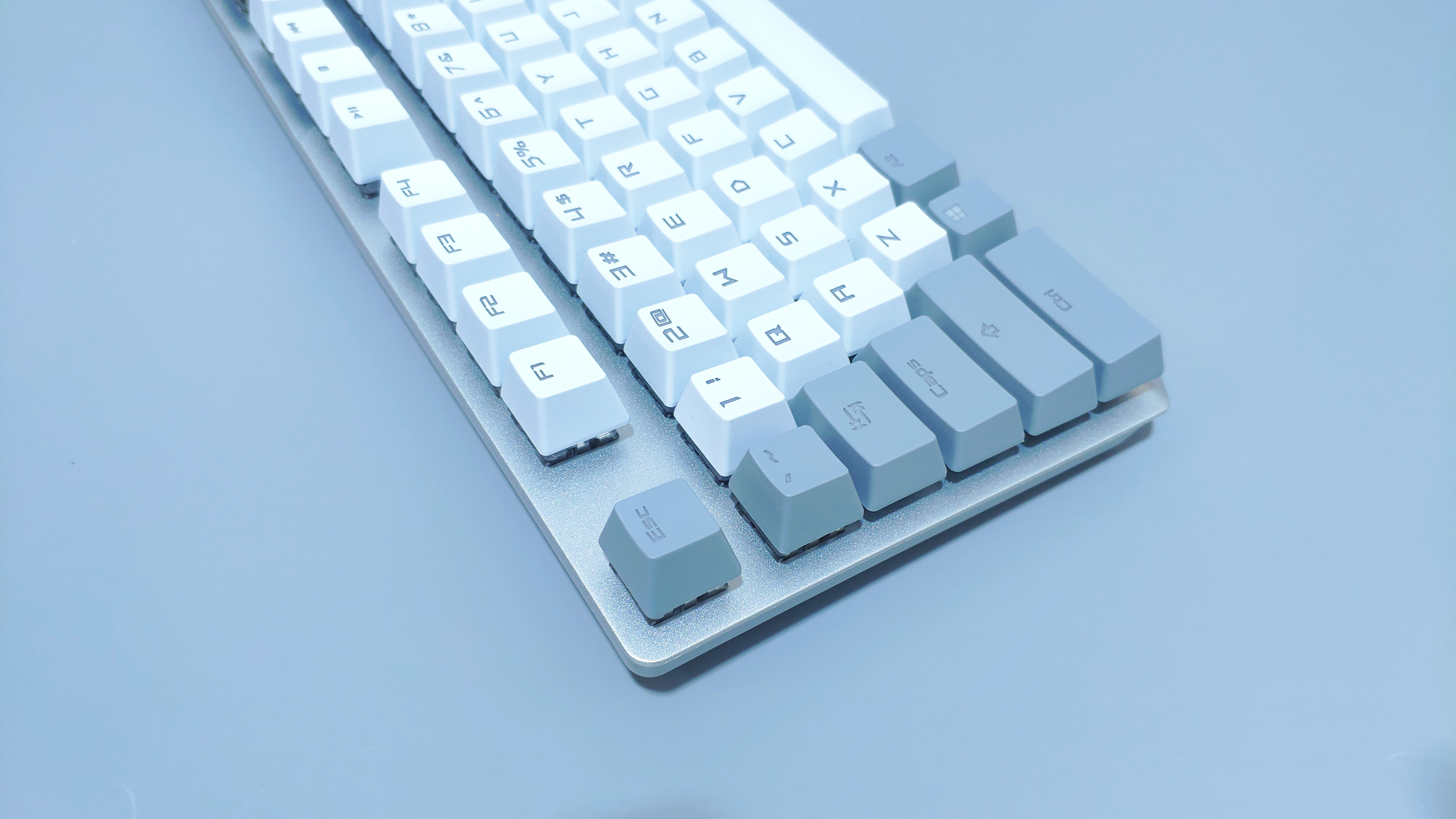 键帽的配色如图为深灰+白,与ROG游侠NX TKL月耀白搭配相得益彰,材质是ABS,应该是为了配合FPS玩家进行强力输出,ROG游侠NX TKL按键特别有一长一短的设计。
