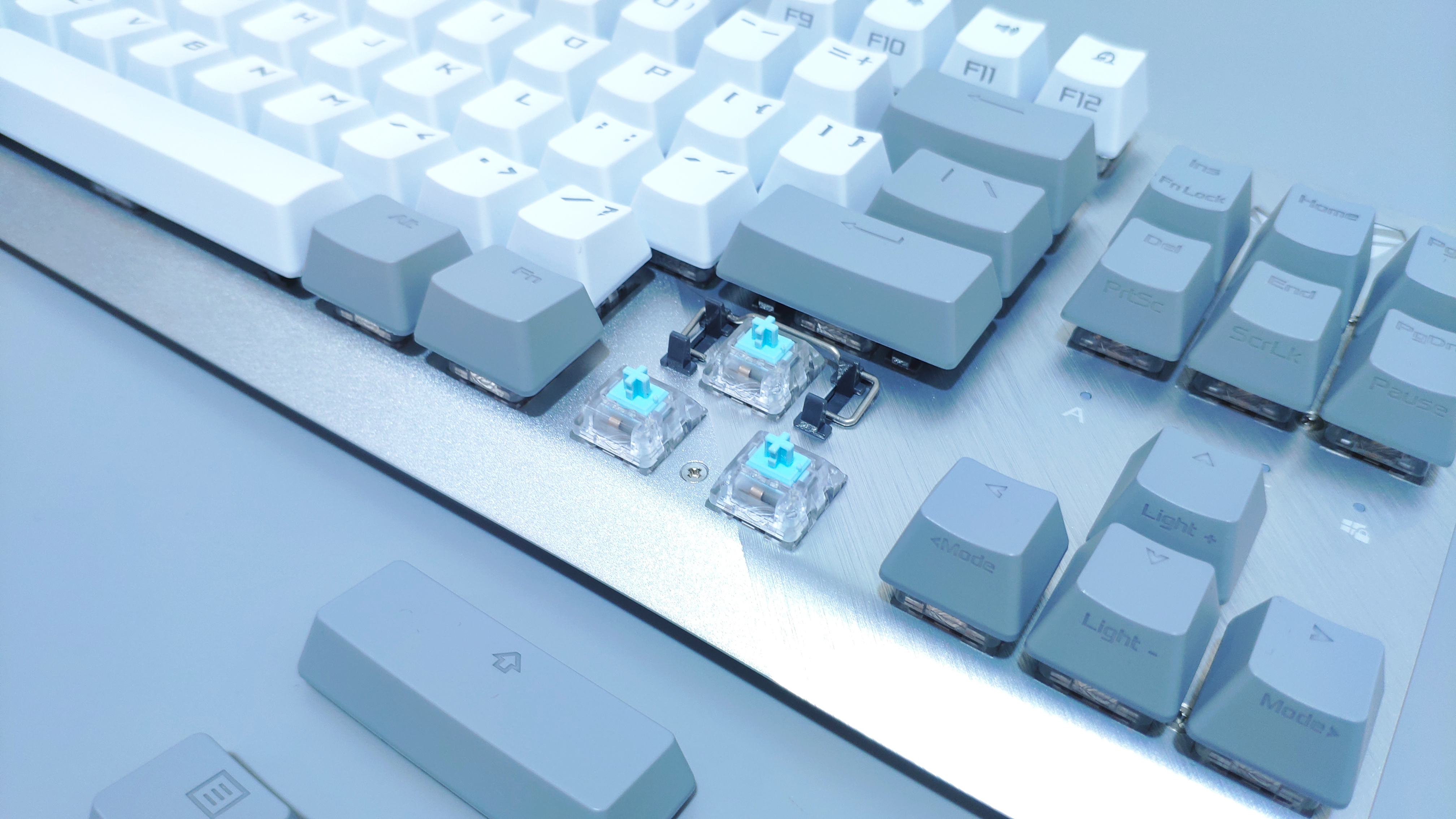 接下来到了看轴的环节,上手的这把ROG游侠NX TKL选择了NX冰川蓝机械轴体,从上图的参数可知,对应了常见的Cherry青轴,但40g的初始压力更低,手感比较讨好游戏玩家,敲击感优秀,所以之前偏好Cherry青轴的用户可以直接选择上手NX冰川蓝轴。