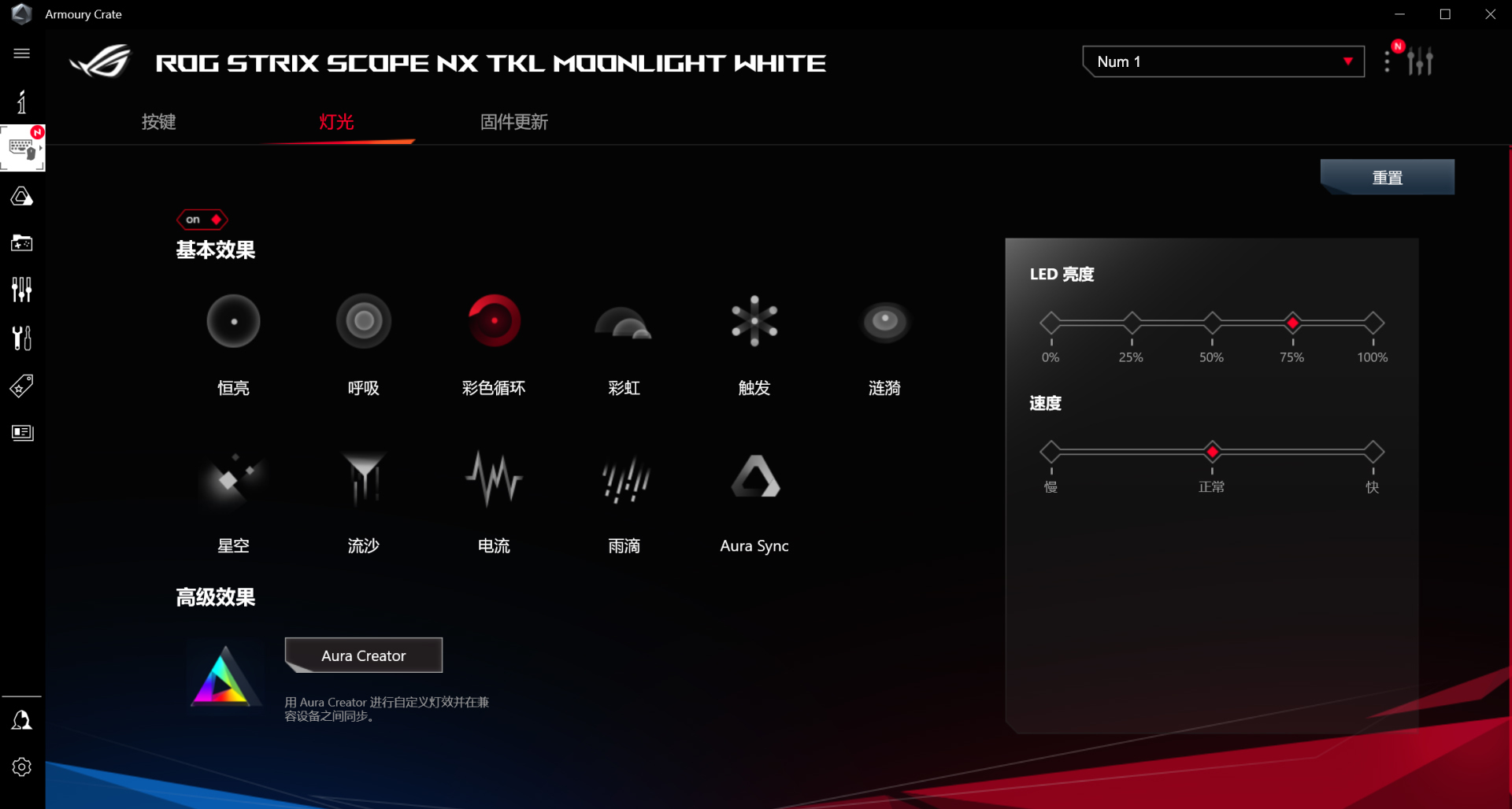 驱动方面,开篇有提到ROG 游侠NX TKL可以联动华硕自家的主板、显卡、水冷、鼠标等配件实现RGB神光同步,方法是在Aura Sync软件中进行设置,当然还能对灯效模式进行选择。