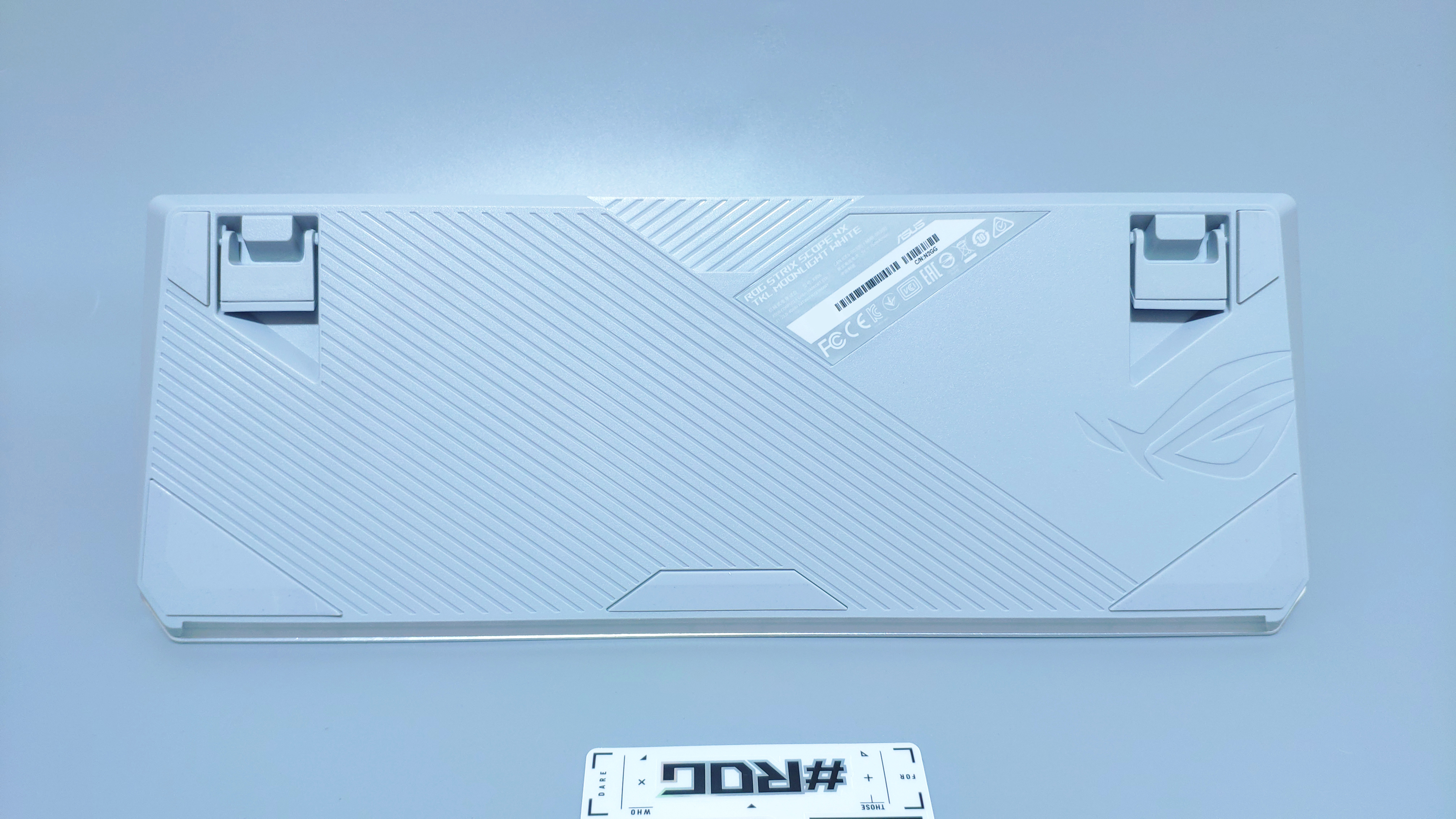 键盘背面的设计正好与正面面板的拼接呼应上了,左侧大概三分之二部分的线条对应了磨砂工艺,右侧大概三分之一部分的平面对应了拉丝工艺,当然少不了一枚大大的logo,即使是背面,也是满满的设计感,营造出凌厉的游戏氛围,要么说ROG外设的细节到位呢。
