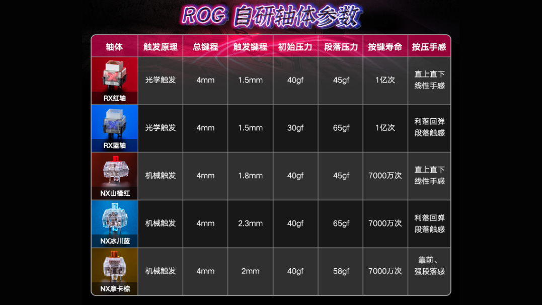 关注机械键盘及其周边的用户不难发现,之前机械键盘使用的大多都是各种Cherry轴,但现下的轴体选择多了,尤其像ROG这样的一线外设品牌,适时推出了自家研发的NX机械轴体,截止目前,ROG有RX红轴、RX蓝轴两光学+NX山楂红、NX摩卡棕、NX冰川蓝三机械共5款自研轴体,轴体参数可以参考下图。