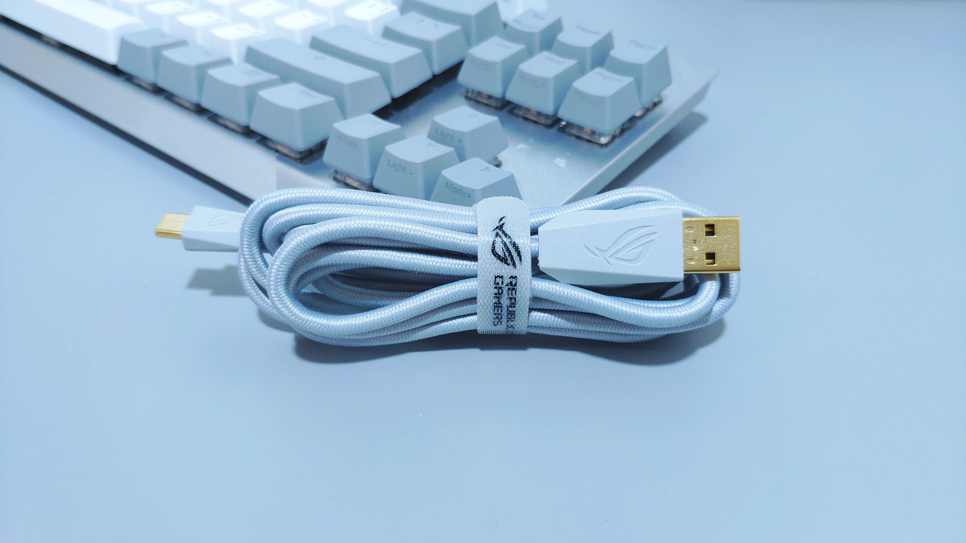 开箱后能够获取到ROG游侠NX TKL月耀白机械键盘*1、USB to Type-C数据线*1、说明书*1、保修卡*1,感觉“败家之眼”logo简直无处不在,甚至可以在编织数据线两端的插头处见到,大概就是这些,开箱环节结束。