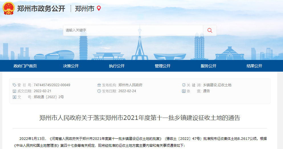2月24日,市政府发布关于落实郑州市2021年度第十一批乡镇建设征收土地的通告,拟征收主城区集体土地8.2617公顷,约合124亩,征收土地用途为中小学用地和道路用地。
