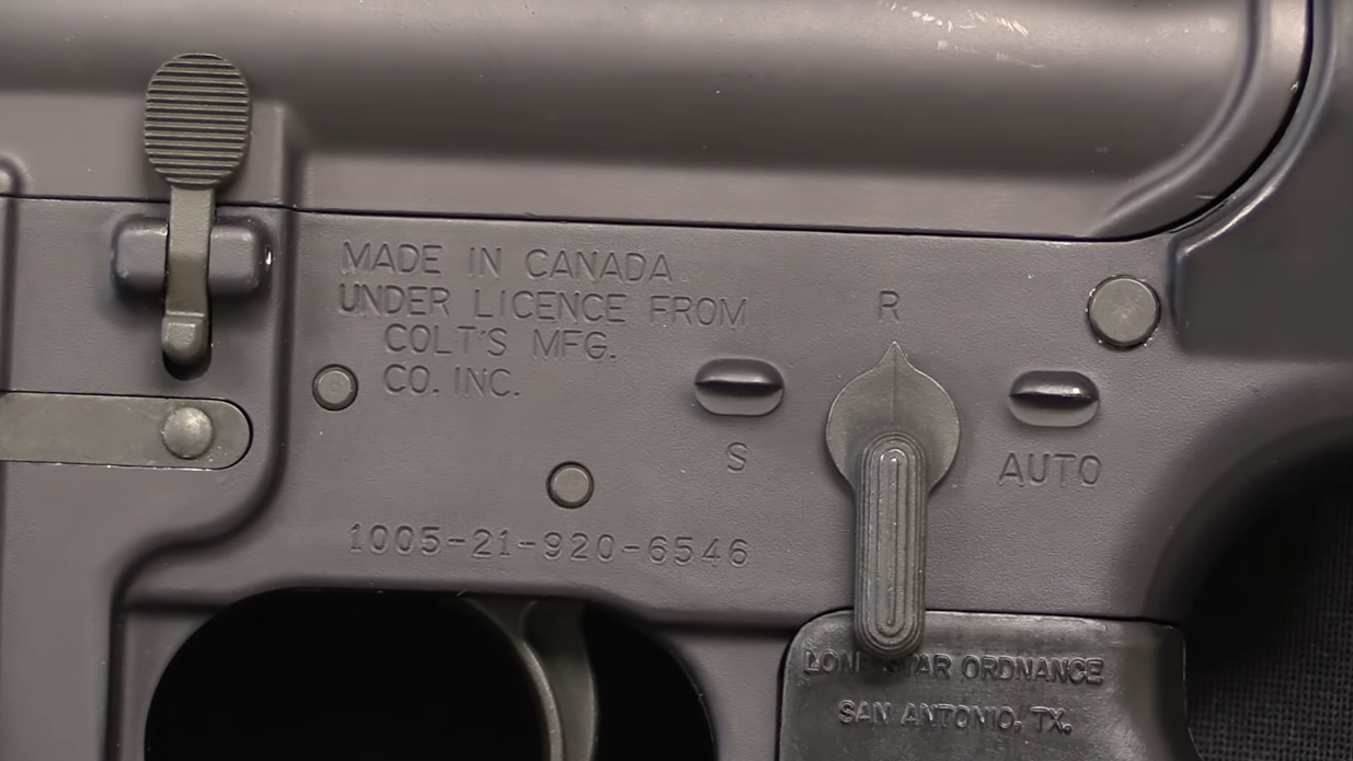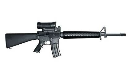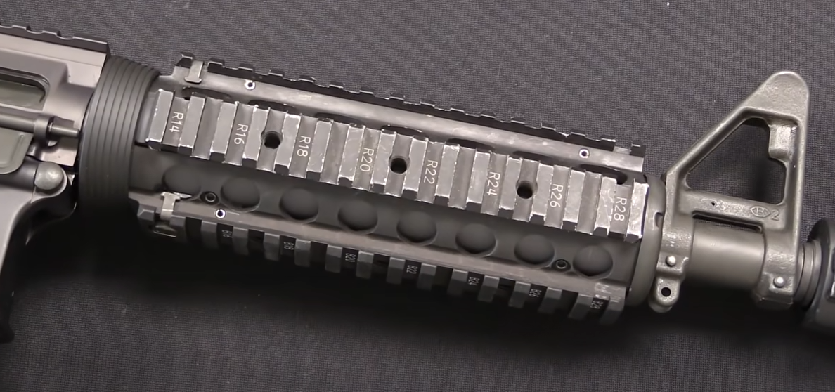 另外这把枪和M4相比,最大的改观就是机匣顶部是平顶的,而且这是最早采用平顶机匣的AR15,同一时期的AR15,别管是M16还是M4,顶部都是带有提把的。而加拿大人取消了提把之后,取而代之的是采用了导轨,可以在上面加装瞄准镜之类的东西。